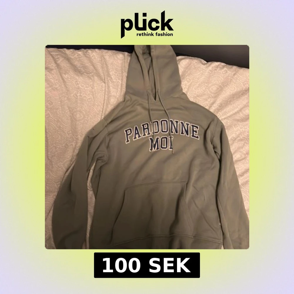 Snygg grön hoodie från WINWIN i storlek L med texten 'PARDONNE MOI' i vitt och mörkblått på bröstet. Tröjan har huva med snörning, stor magficka och långa ärmar. Perfekt för chill dagar och streetstyle.
