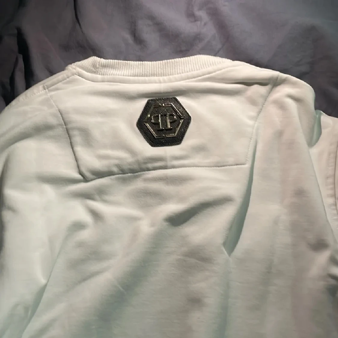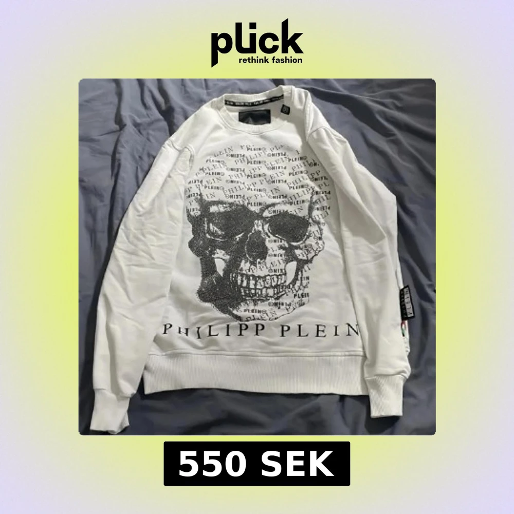 Säljer en vit sweatshirt från Philipp Plein med stor döskalle framtill, dekorerad med text och glittriga detaljer. Tröjan har ribbade muddar, lång ärm och ett metallmärke med PP-logga på ryggen. Perfekt för dig som gillar edgy streetstyle.