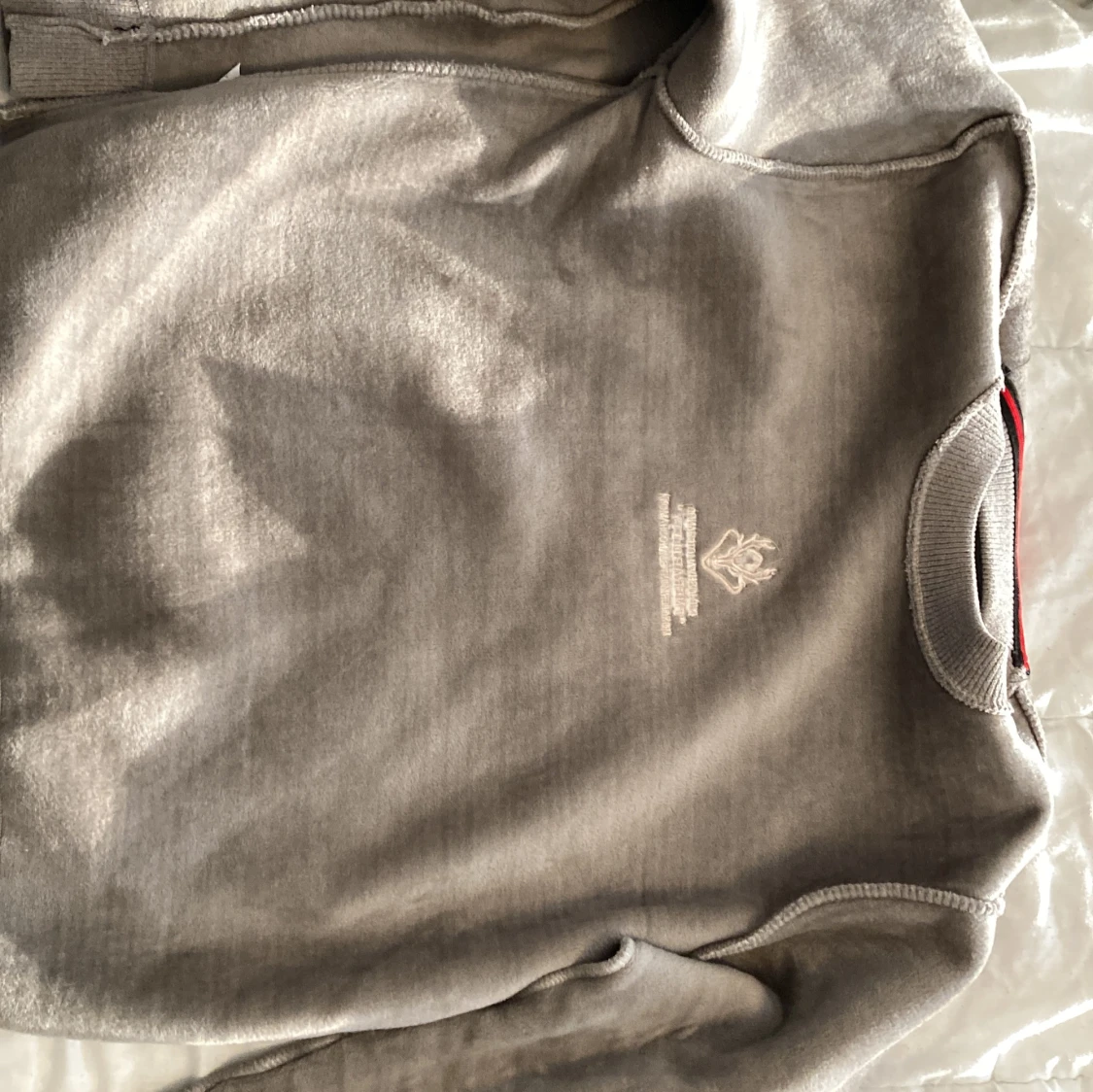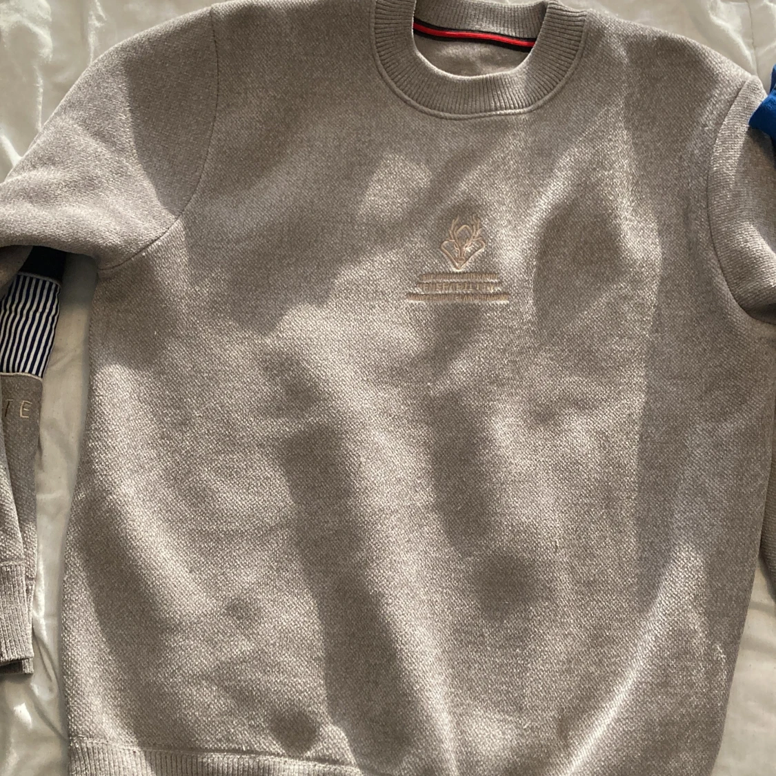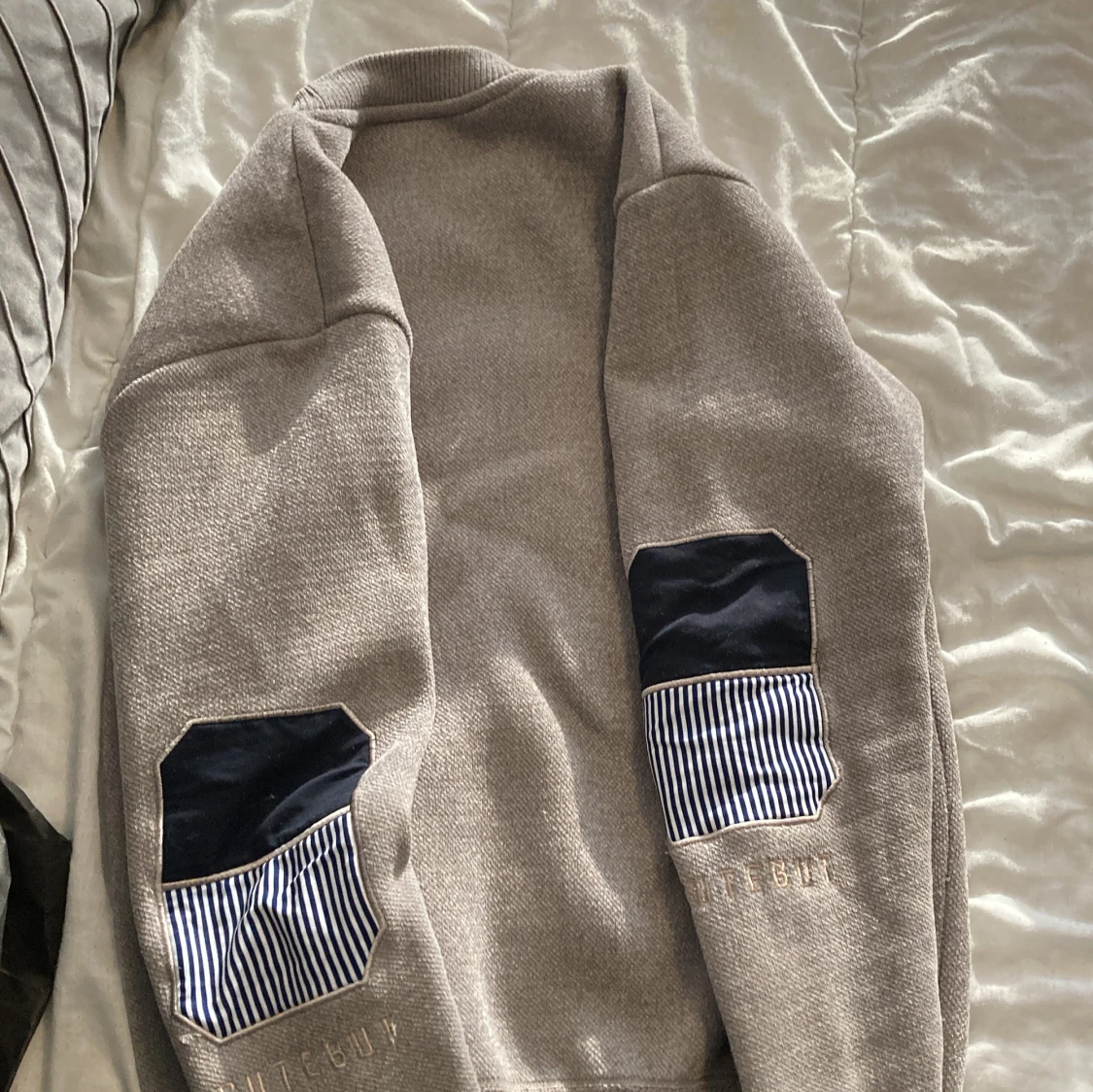 Snygg grå tröja från cuteboy med broderad logga på bröstet. Ärmarna har coola detaljer med mörkblå tygpatch och randigt tyg i vitt och blått. Rund hals och ribbade muddar. Perfekt för dig som gillar unika detaljer och stilren design. Storlek på den är M-L