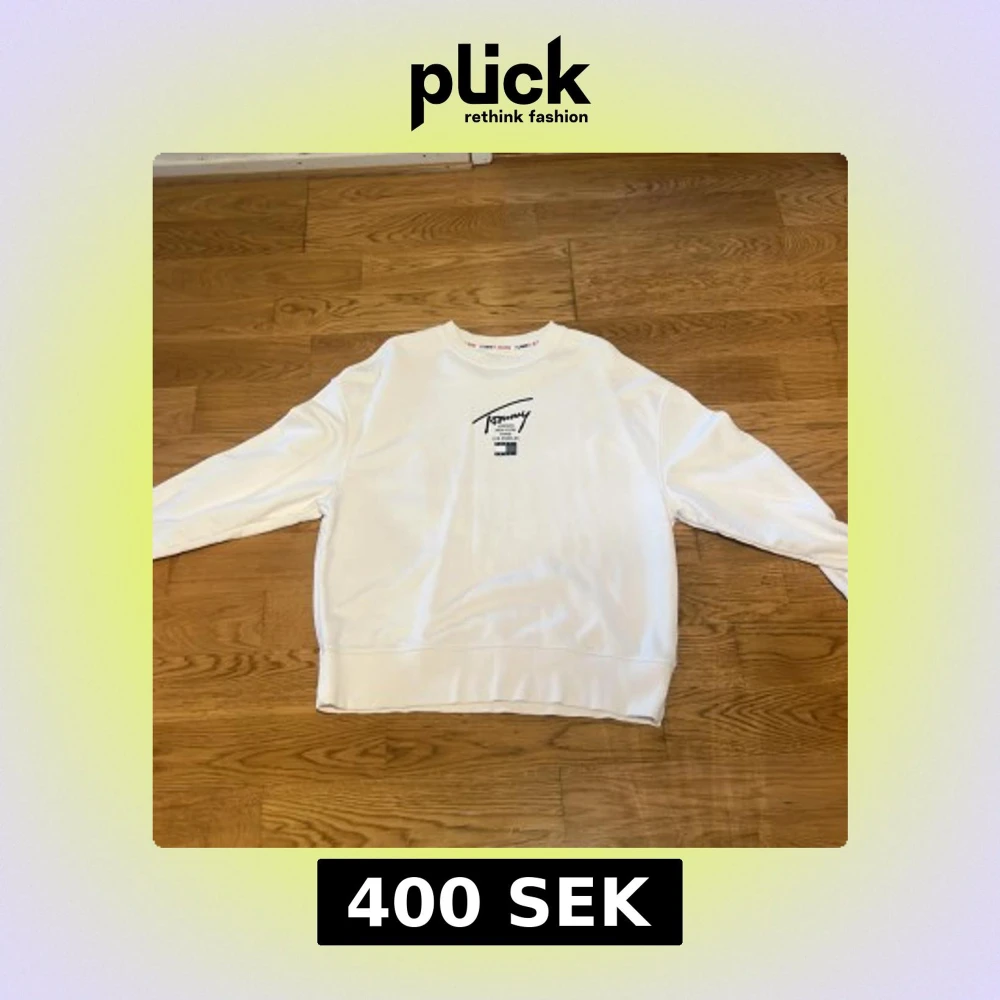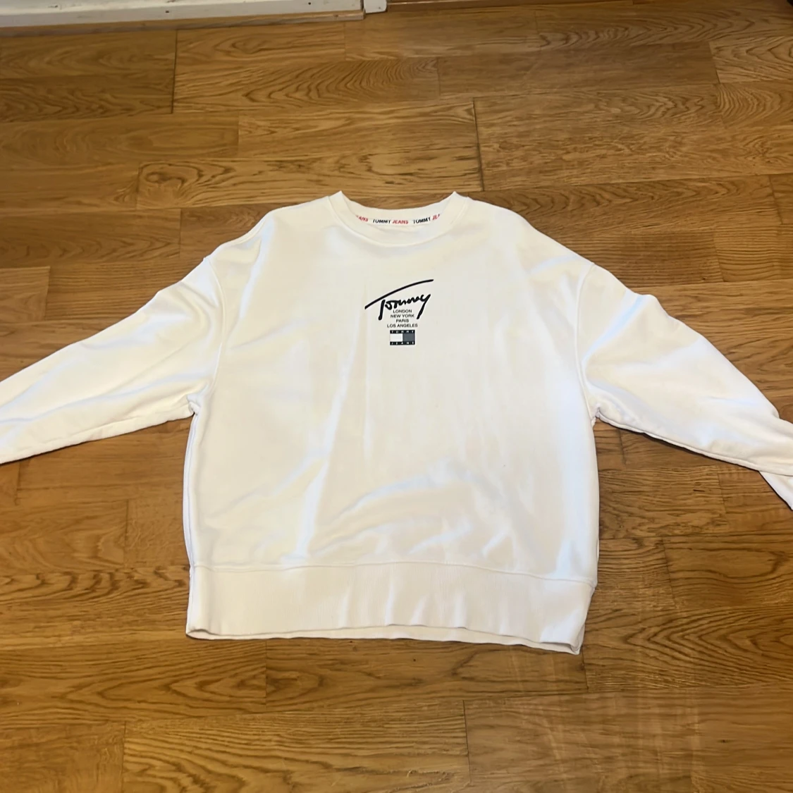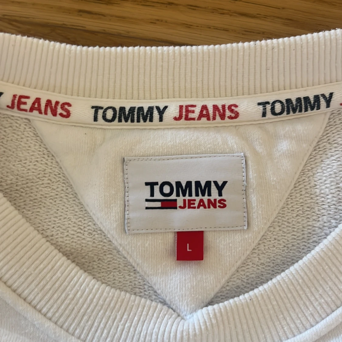 Säljer en vit tröja från Tommy Jeans med tryckt logga på bröstet och ryggen. Tröjan är köpt i Köpenhamn men saknar kvitto. Tröjan är i väldigt bra skick och har enbart använts någon enstaka gång. Storleken på tröjan är L. Hör gärna av dig om du har frågor eller om det önskas fler bilder!