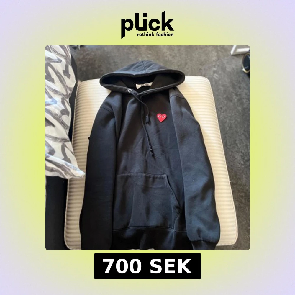 Svart hoodie med huva och dragsko från Comme des Garçons Play. På bröstet finns ett broderat rött hjärta med ögon. Tröjan har magficka och ribbade muddar vid ärmslut och nederkant. Perfekt för en avslappnad stil. Skriv vid frågor😎