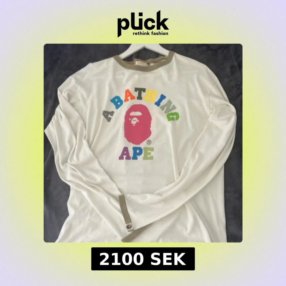(pris kan diskuteras)Vit långärmad tröja från A Bathing Ape med färgglad logga och ikoniskt ape-motiv på bröstet. Tröjan har beige muddar vid hals och ärmslut en liten etikett med ape-loggan vid ärmen.