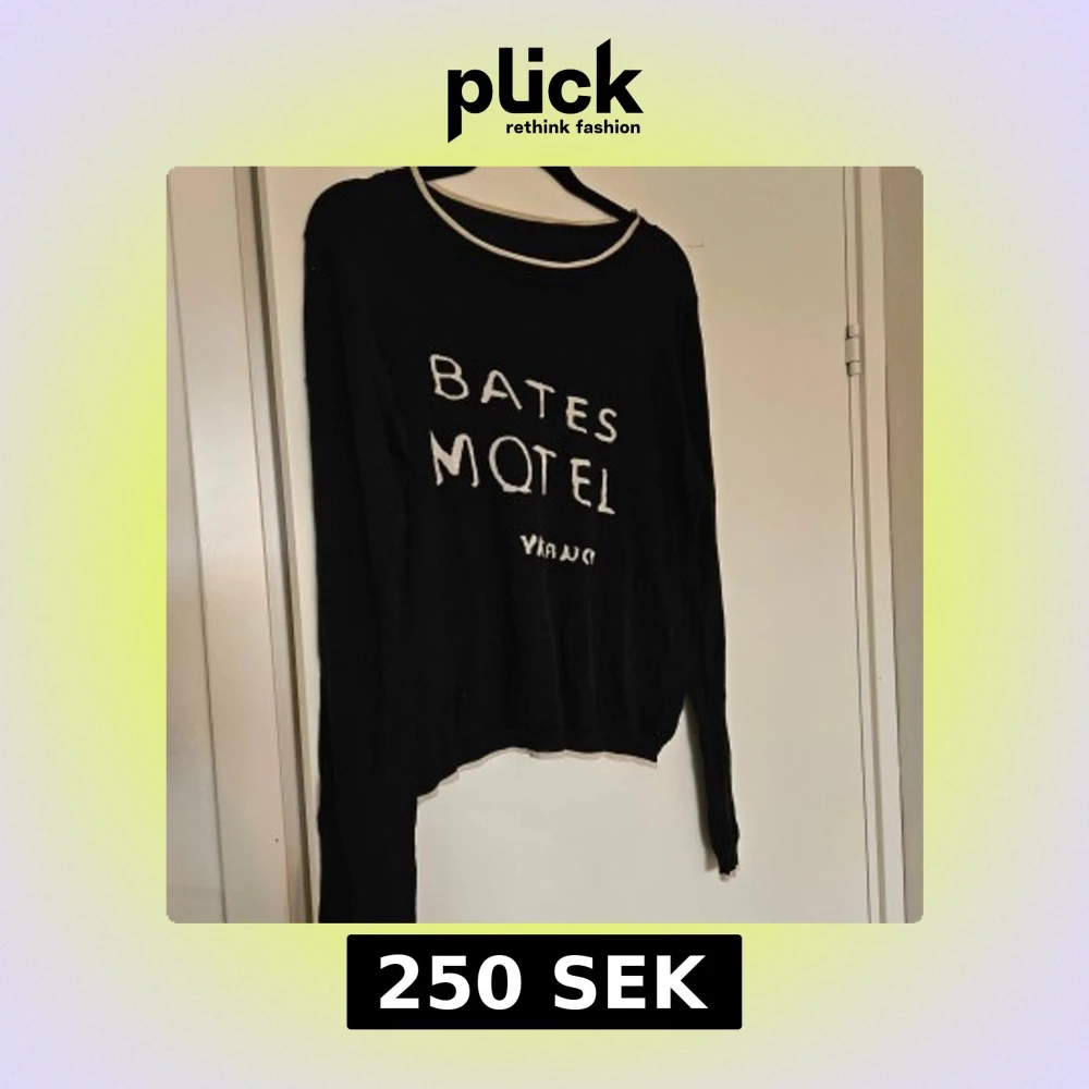 Superfin tunn, svart stickad tröja i 100% silke. Svart med vit text 'Bates Motel Vacancy'. Fint skick. Litet ihoosytt hål på baksidan som knappt syns. Storlek L skulle jag uppskatta