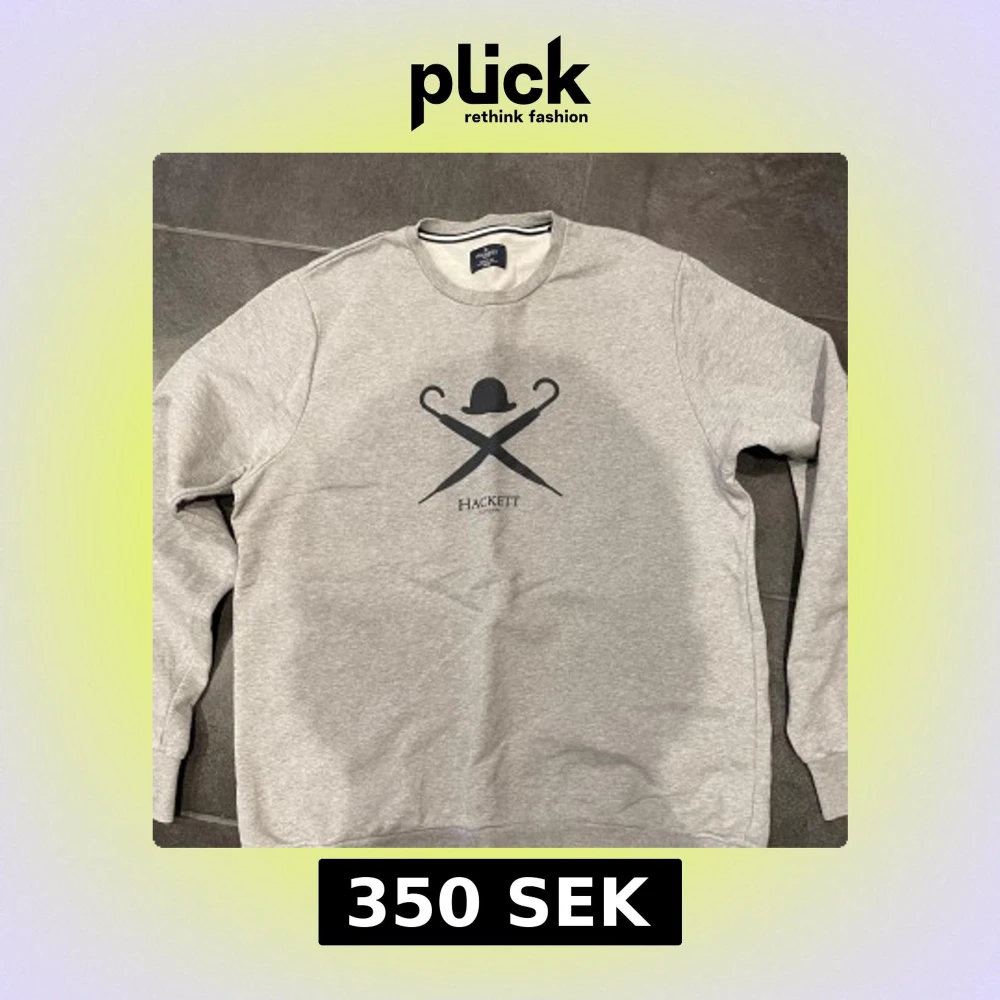 Säljer en stilren grå sweatshirt från Hackett med ett klassiskt tryck av en hatt och korsade paraplyer på framsidan. Tröjan har rund hals och långa ärmar, perfekt för en avslappnad stil.