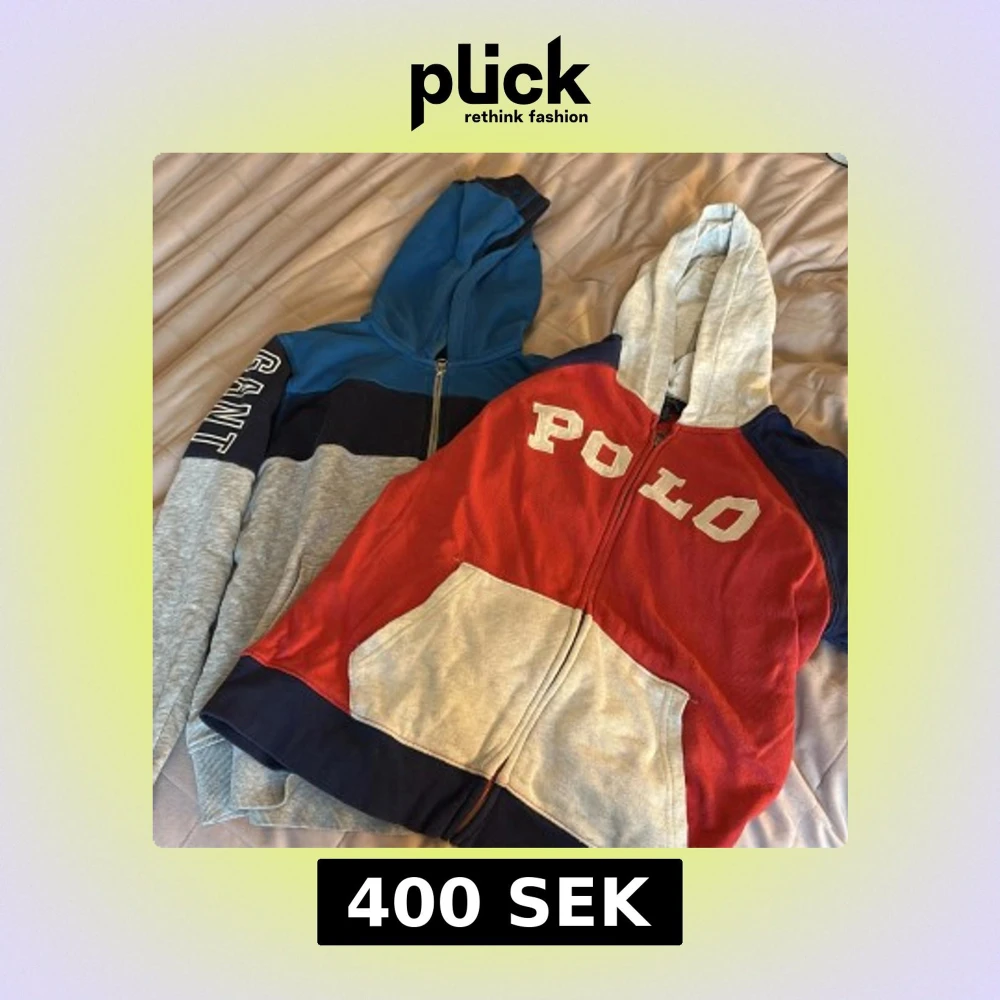 Säljer två snygga hoodies! En Polo Ralph Lauren med röd, grå och marinblå färgblock, stor ficka fram och vit POLO-tryck. Den andra från GANT har blå, marinblå och grå färgblock med GANT-tryck på ärmen. Båda har huva och dragkedja. Priset kan diskutera