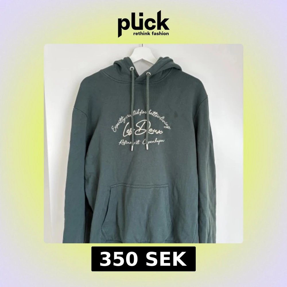 Säljer en mörkgrön hoodie från Les Deux med vit broderad text på bröstet. Tröjan har huva med dragsko och en stor magficka. Perfekt för en avslappnad stil. Använd typ 2 gånger.