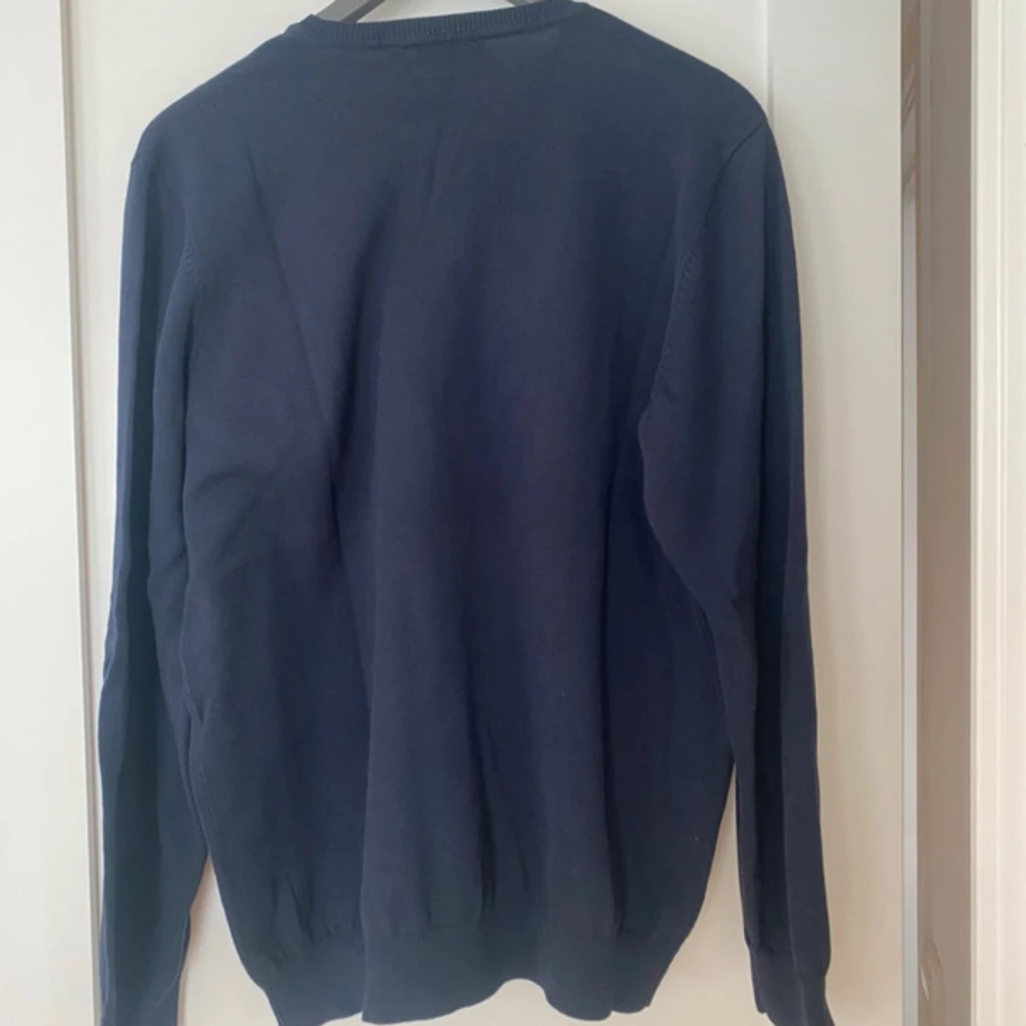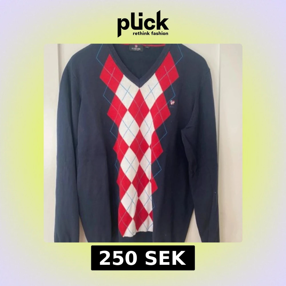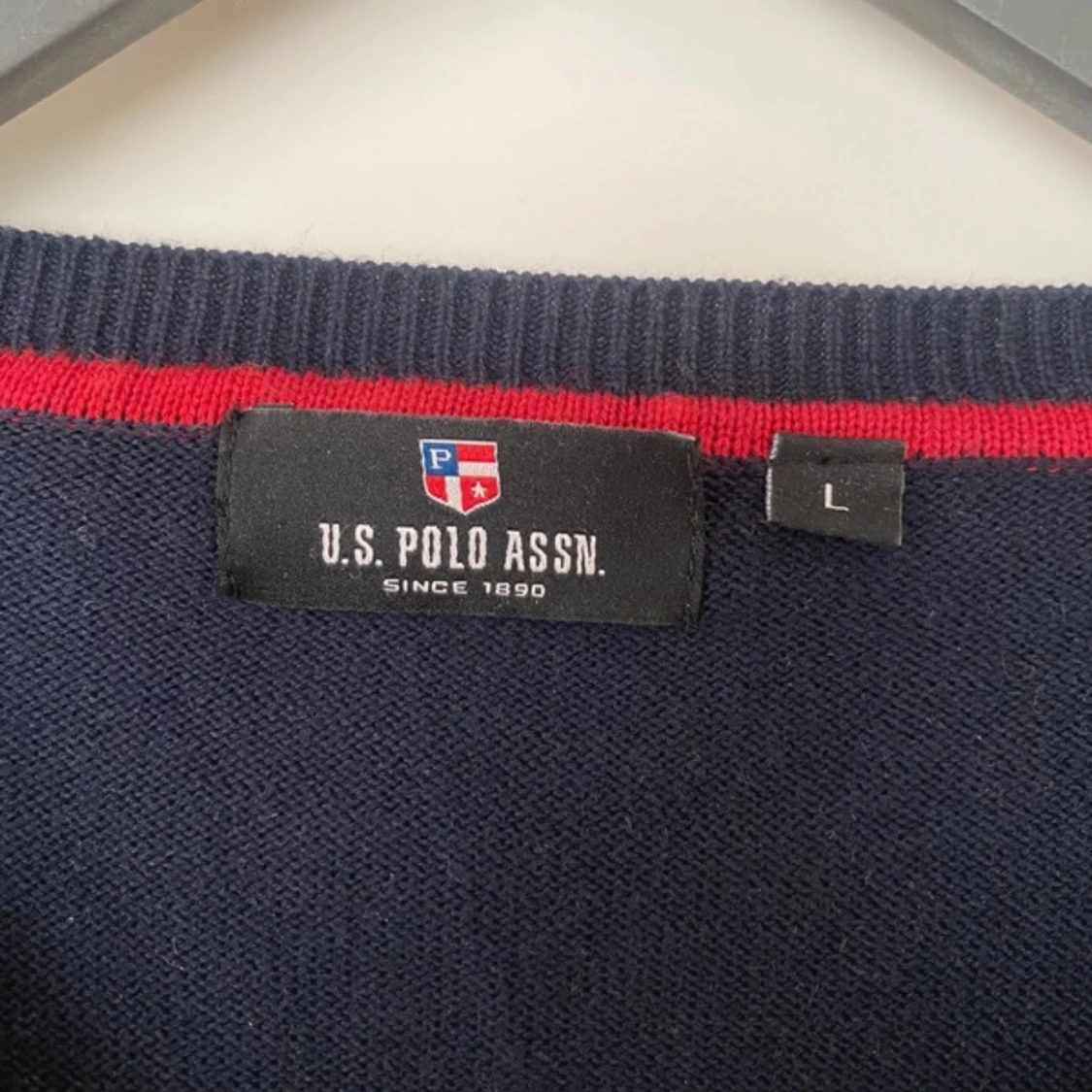 Säljer en stilren mörkblå tröja från U.S. Polo Assn. med ett klassiskt argyle-mönster i rött och vitt på framsidan. Tröjan har en v-ringad hals och långa ärmar, perfekt för en elegant look. Passar bra till både vardag och mer uppklädda tillfällen.