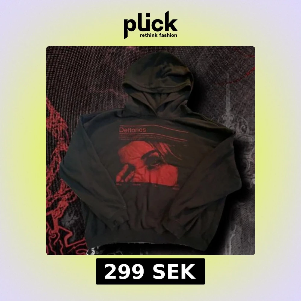 Svart hoodie med stor röd Deftones-grafik på bröstet. Trycket visar ett ansikte och låttitlar från bandet. Klassisk huva och långa ärmar, perfekt för dig som gillar bandmerch och vill sticka ut med en cool streetstyle.