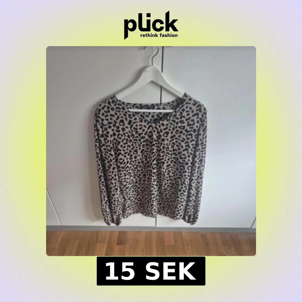 Säljer en beige långärmad tröja med svart leopardmönster. Tröjan har rund halsringning och är i ett mjukt, material som känns skönt mot huden.