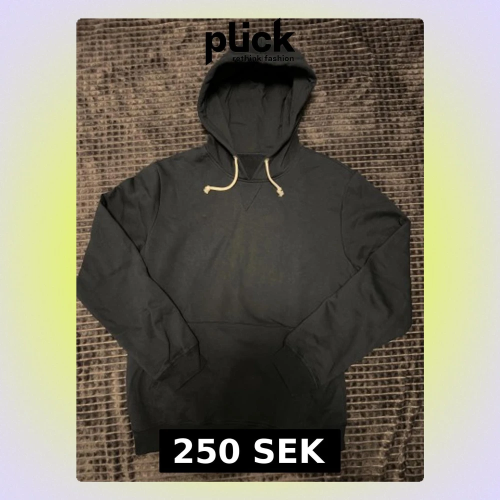 Svart hoodie med klassisk huva och vita snören. Tröjan har lång ärm och en enkel, clean design utan tryck eller mönster. Perfekt för chill dagar och passar till det mesta. Materialet känns mjukt och bekvämt, troligen bomull eller en bomullsblandning.