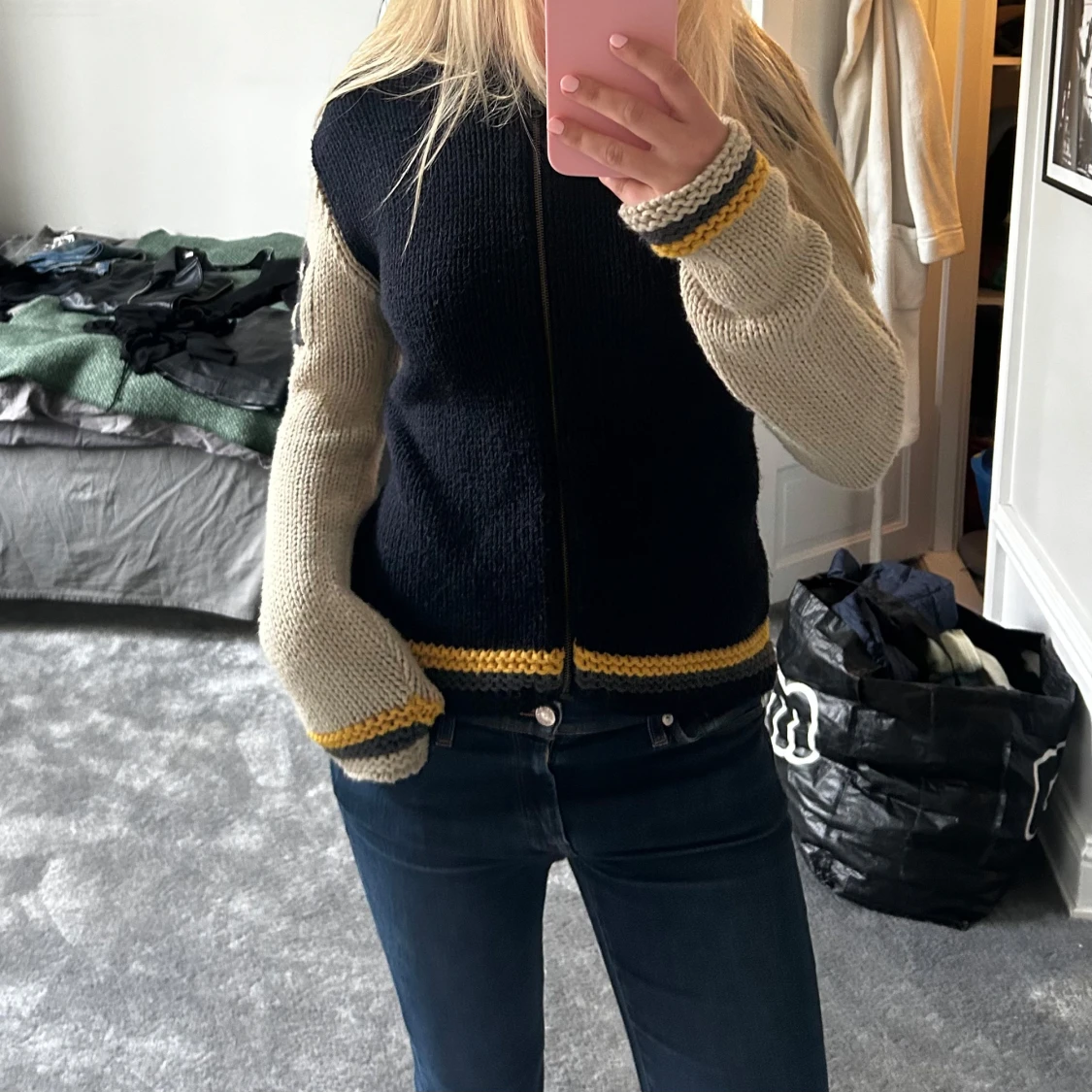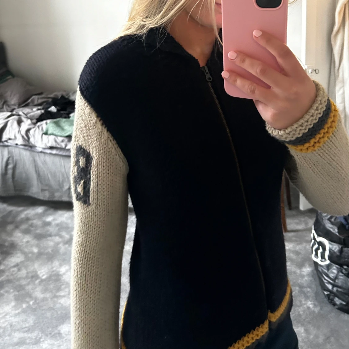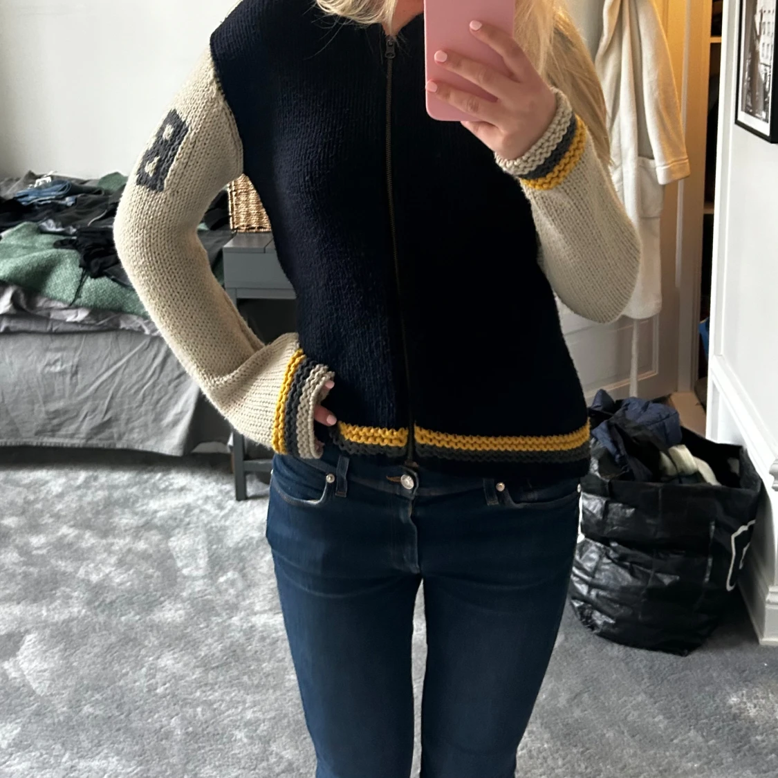 Säljer en snygg marinblå och beige stickad kofta med dragkedja. Koftan har långa ärmar med ett nummer på ärmen och gula detaljer vid ärmslut och nederkant. Perfekt för en avslappnad stil.