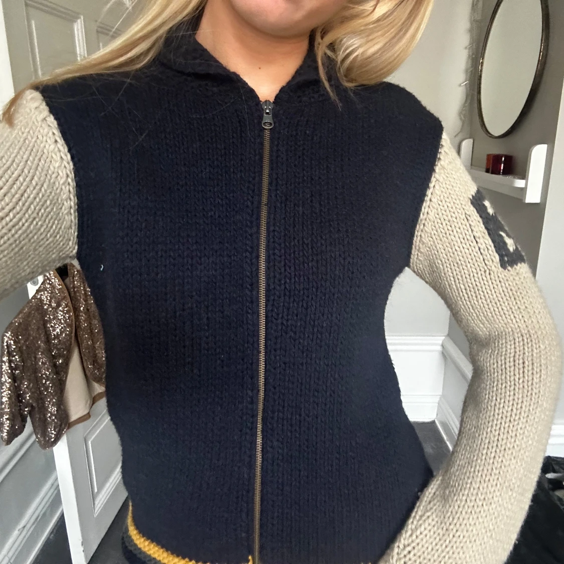 Marinblå och beige stickad kofta med dragkedja