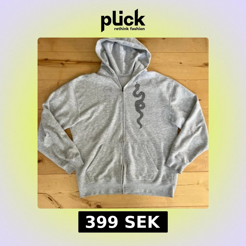 Säljer en grå hoodie med dragkedja och ett coolt ormmönster i svart på framsidan. Tröjan har en luva och praktiska fickor framtill. Perfekt för en avslappnad stil. Tröjan är från madebytrappers
