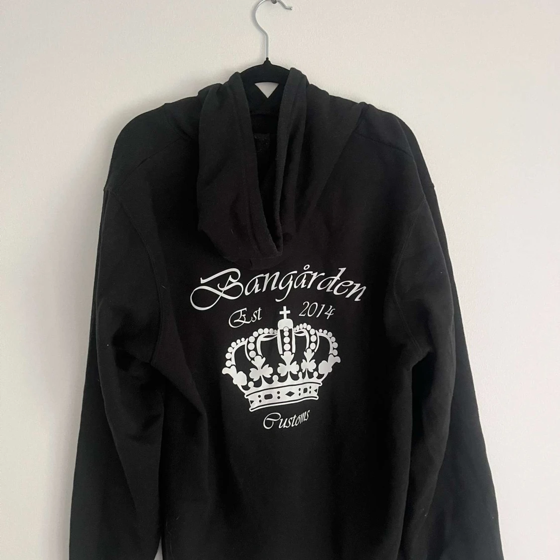 Svart hoodie från Bangården Customs med vit text på bröstet och stort krontryck på ryggen. Tröjan har huva med snörning och en klassisk känguruficka framtill. Perfekt för dig som gillar streetwear och vill sticka ut med coolt motiv. Storlek 2xl men sitter som medium eller small.