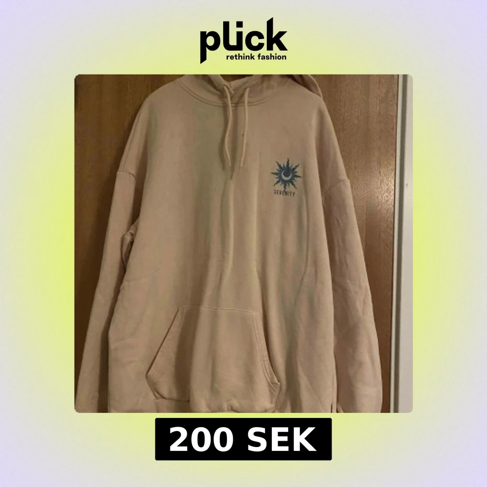 Säljer en oversized beige hoodie med tryck. På bröstet står det 'Serenity' med en blå sol och måne, och på ryggen finns ett stort grafiskt tryck med hand, öga och texten 'Energy Balance'. Hoodien har huva med snörning och stor magficka.