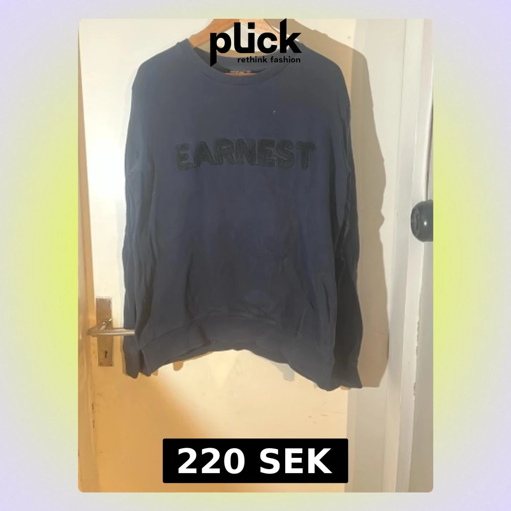 Mörkblå sweatshirt med rund hals och texten 'EARNEST' i sammetsliknande material på bröstet. Tröjan har långa ärmar och ribbade muddar vid ärmslut och nederkant. Perfekt för en avslappnad och stilren look. Mörkblå