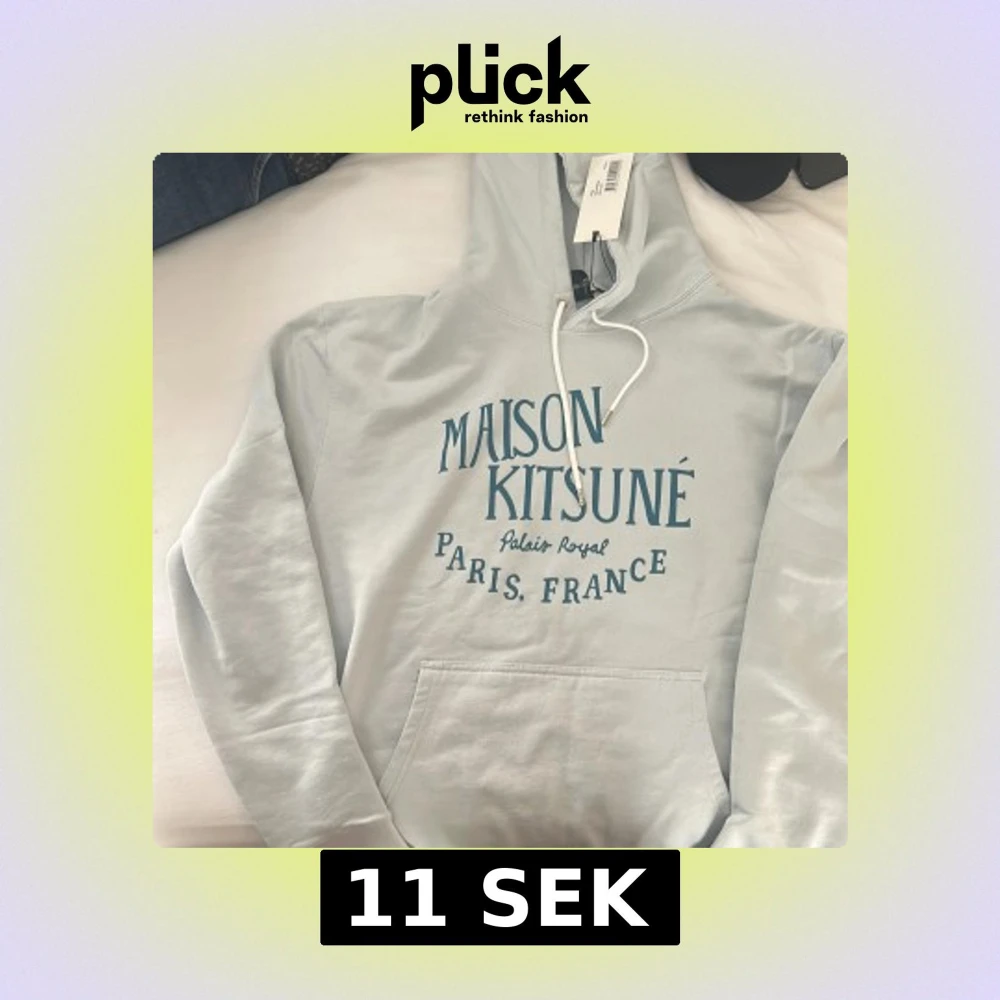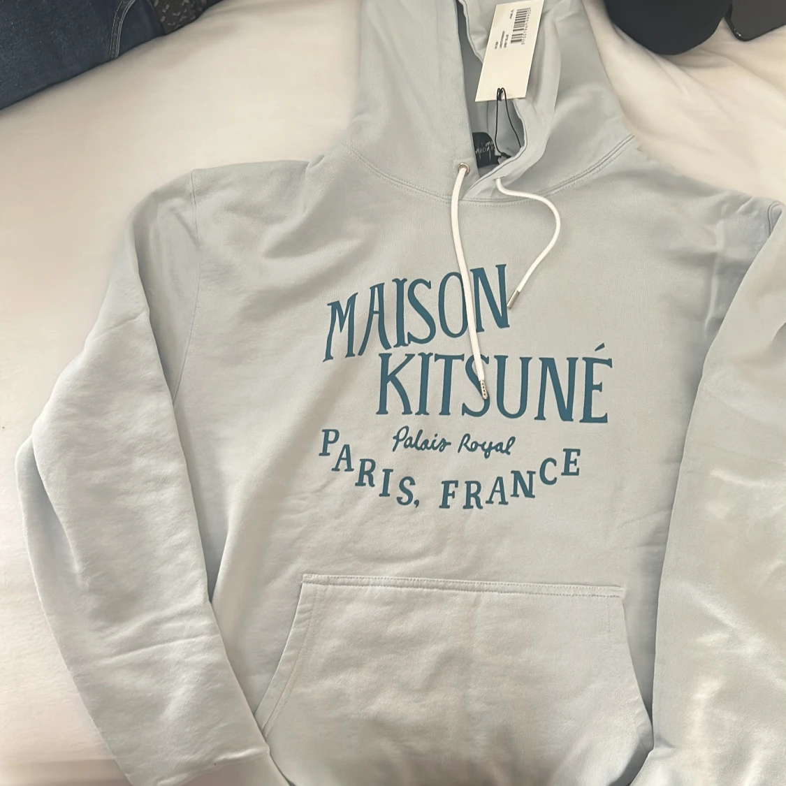 Snygg ljusblå hoodie från Maison Kitsuné med tryck i blått framtill. Klassisk känguruficka, vit snörning i huvan och mjuk bomullskänsla. Perfekt för dig som gillar streetwear och fransk stil.