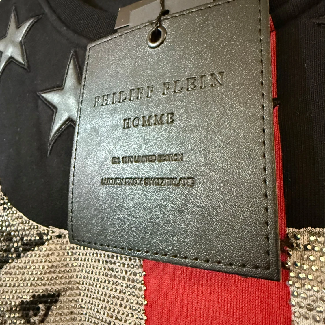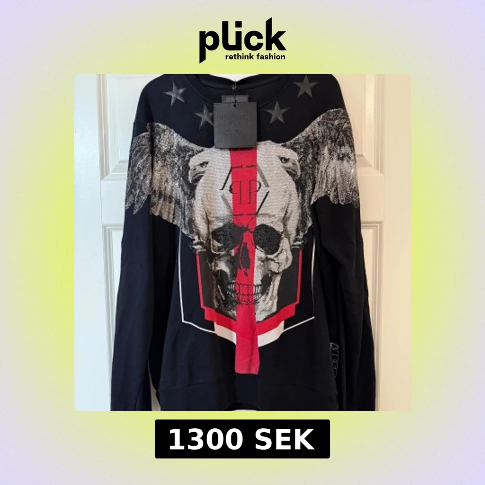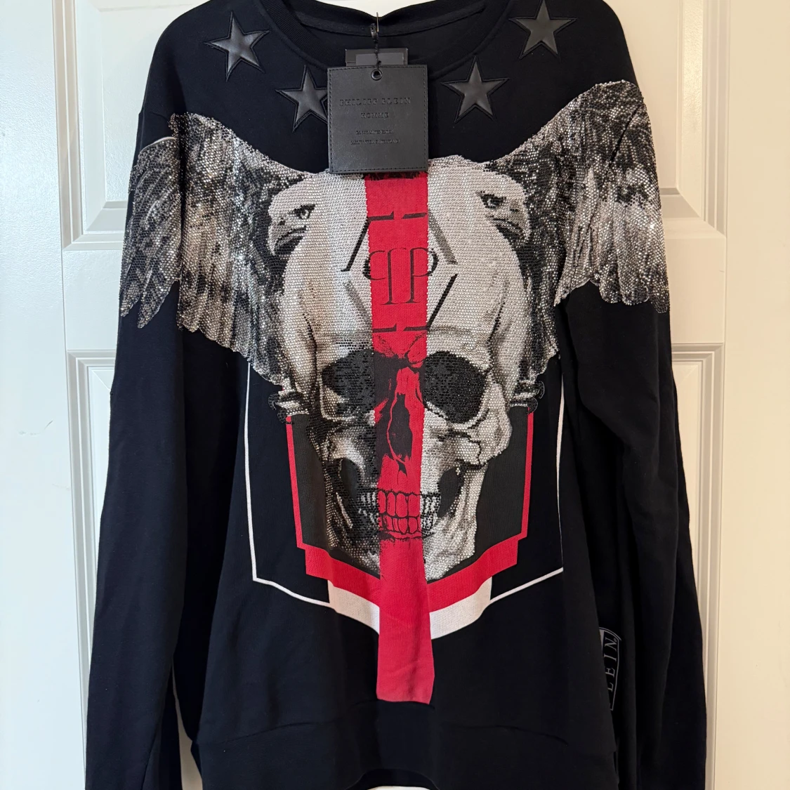 Svart långärmad tröja från Philipp Plein med stort dödskalletryck, vingar och röda detaljer framtill. Tröjan har glittriga paljetter och 3D-stjärnor vid halsen. Swarovski pärlor på. Skicka meddelande för frågor.