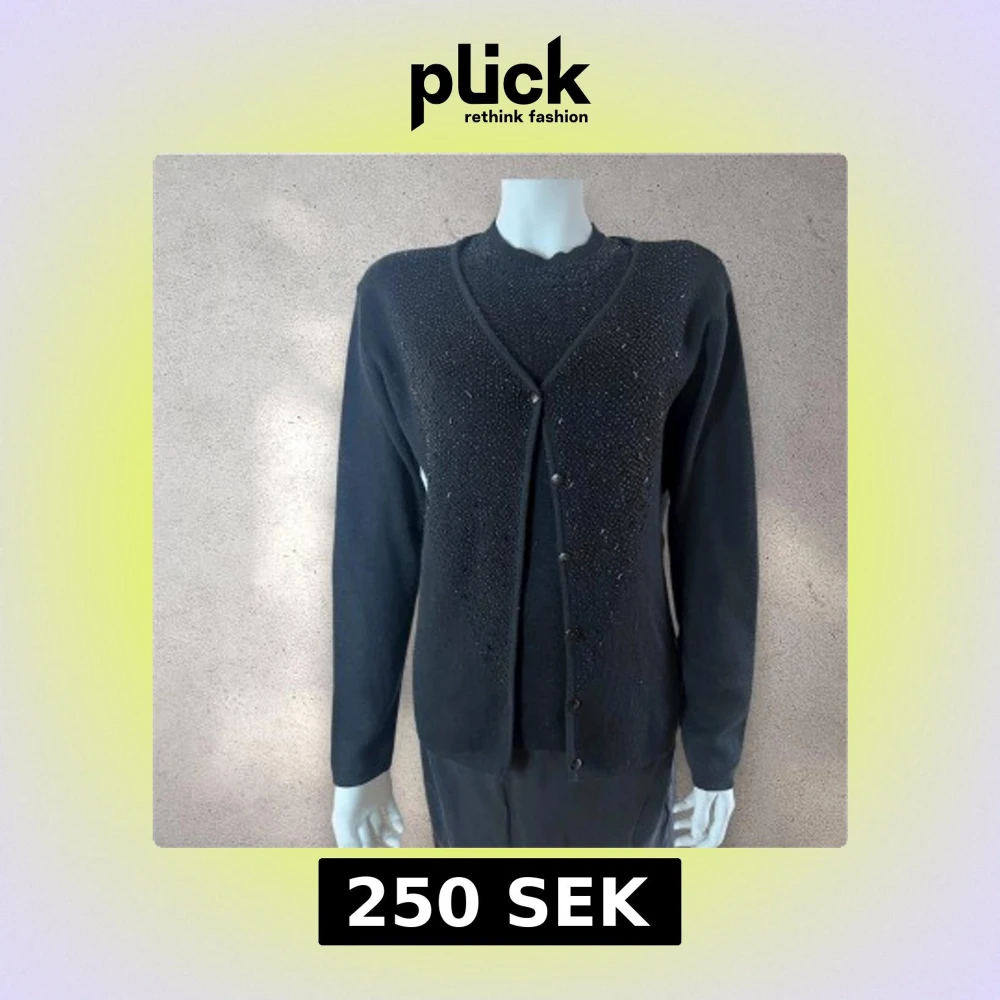 Svart kofta med matchande ärmlös topp, båda dekorerade med små svarta pärlor framtill. Koftan har rund hals och knappar längs framsidan, medan toppen har ribbad halsringning och sitter snyggt mot kroppen. Perfekt för dig som gillar stilrena detaljer. #kofta #topp