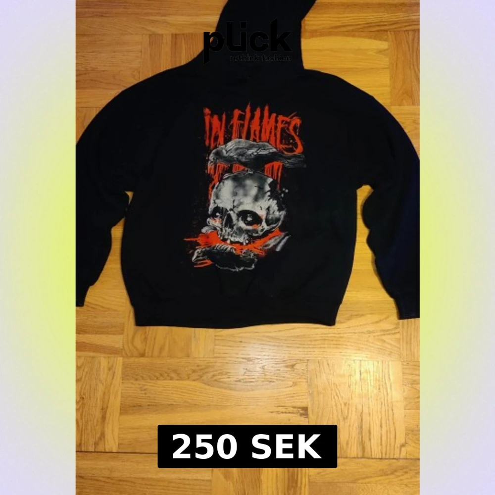 Svart hoodie från Gildan med stort In Flames-tryck på framsidan. Trycket har en dödskalle, korp och röda detaljer som ger en riktigt cool och edgy vibe. Tröjan har huva och långa ärmar, perfekt för dig som gillar bandmerch och vill sticka ut.