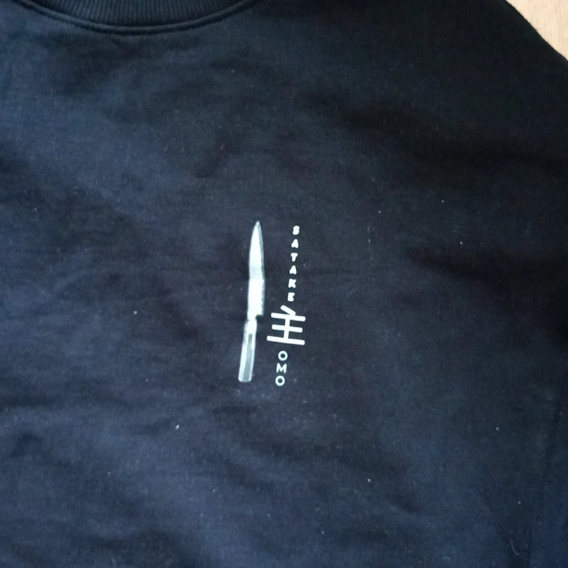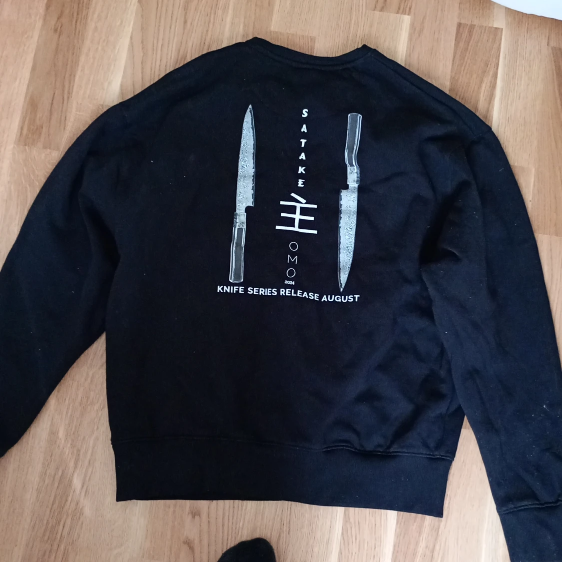 Säljer 2X svart sweatshirt från James Harvest med tryck av knivar och texten 'Satake Omo' på både fram- och baksidan. Tröjan har långa ärmar och en rund halsringning. Perfekt för dig som gillar unika tryck! Erbjuder 600 för båda och 350 för en. Pris kan diskuteras