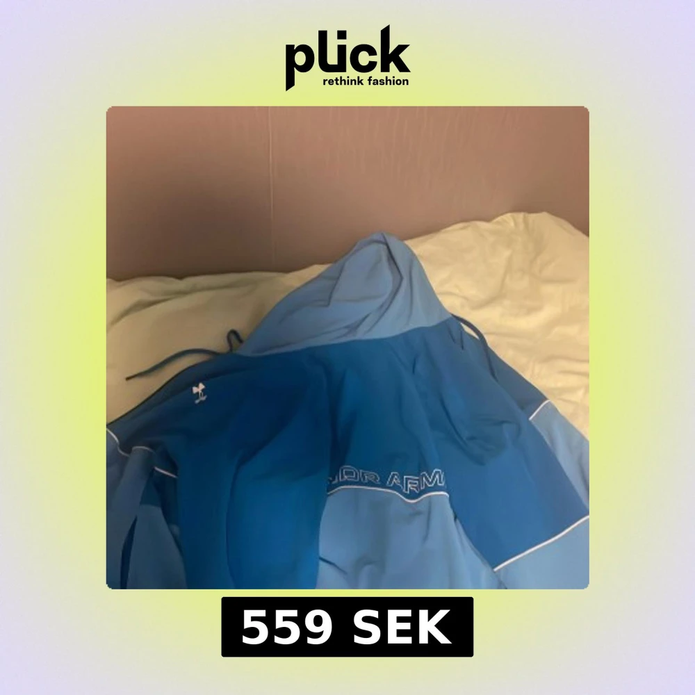 Säljer en blå hoodie från Under Armour med justerbar huva och logotyp på bröstet. Perfekt för träning eller vardagsbruk. Den har en sportig look och är bekväm att bära.