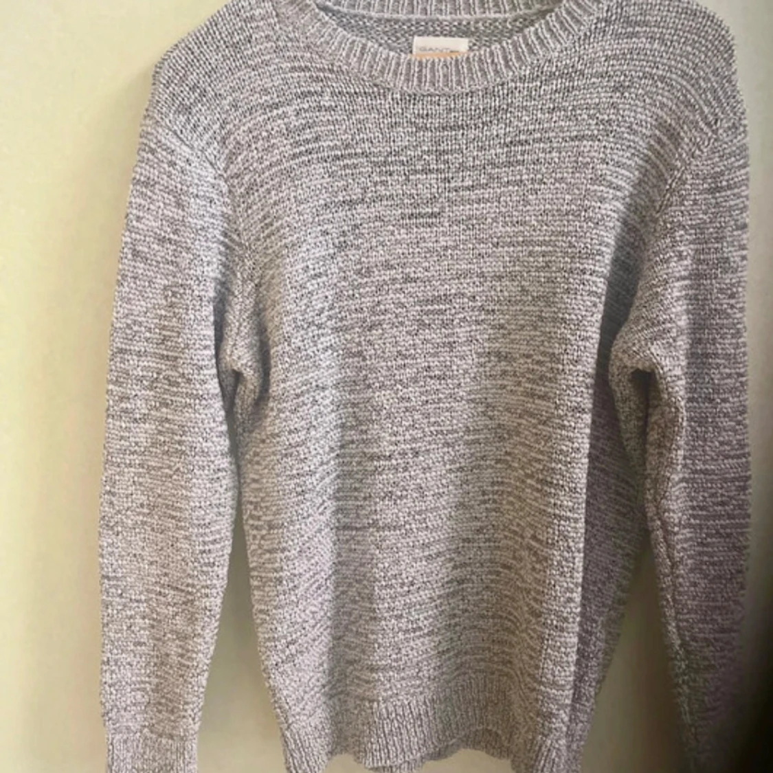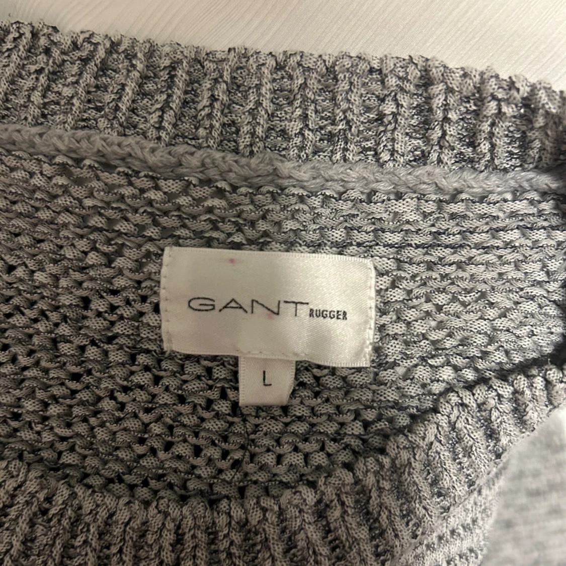 Säljer en stilren grå stickad tröja från GANT Rugger. Perfekt för kyliga dagar med sin mjuka och bekväma passform. Tröjan har långa ärmar och en klassisk rund halsringning.