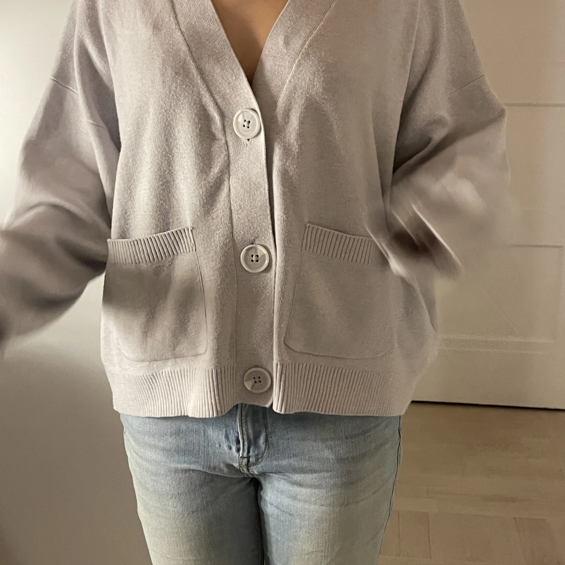 Finstickad ljusgrå kofta. Mycket bra skick och passar S-L! Modellen är M