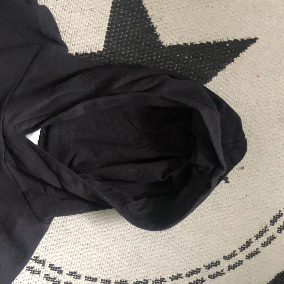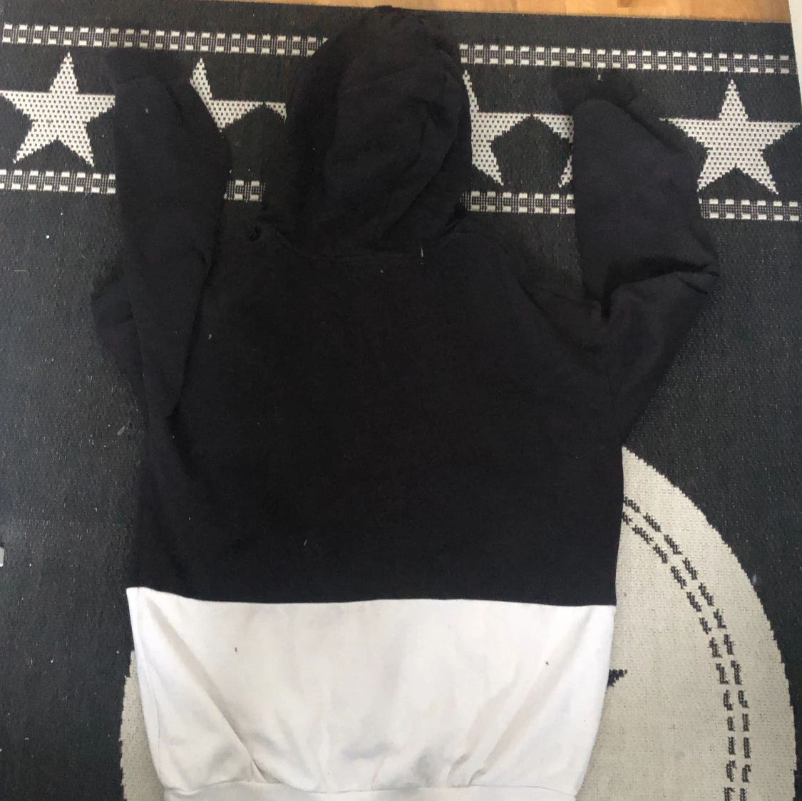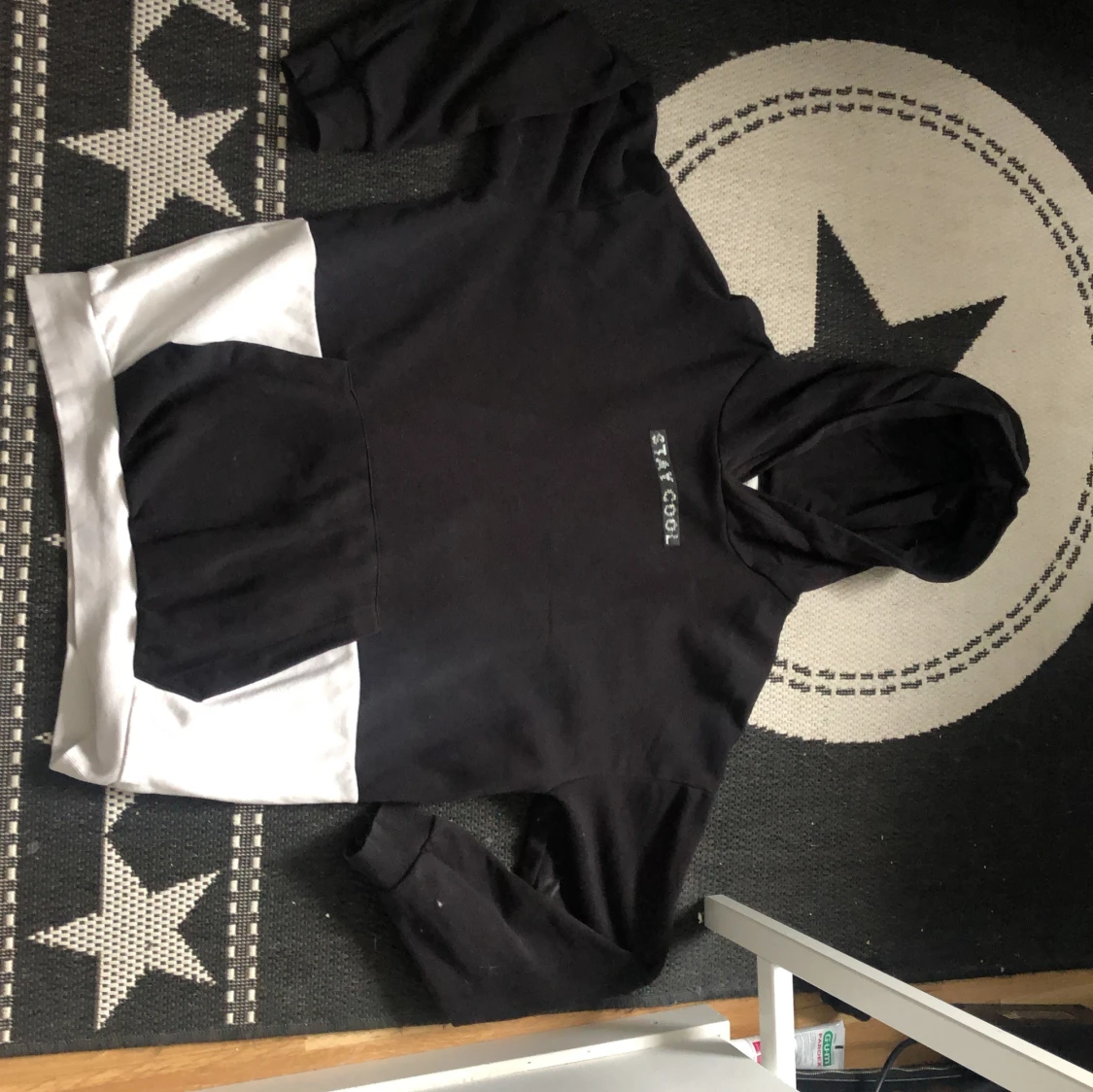 Säljer en svart och vit hoodie med texten 'STAY COOL' på bröstet. Den har en stor ficka framtill och en bekväm huva. Perfekt för en avslappnad stil.