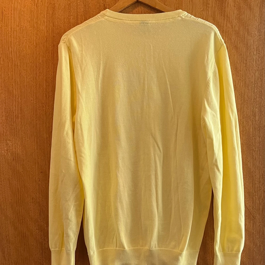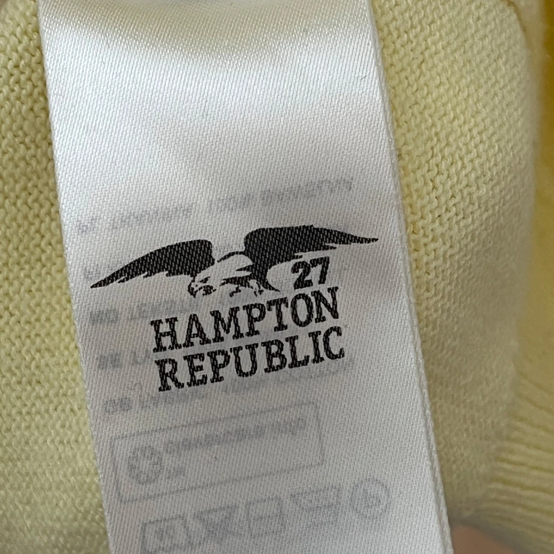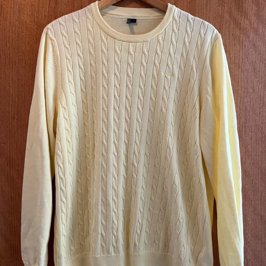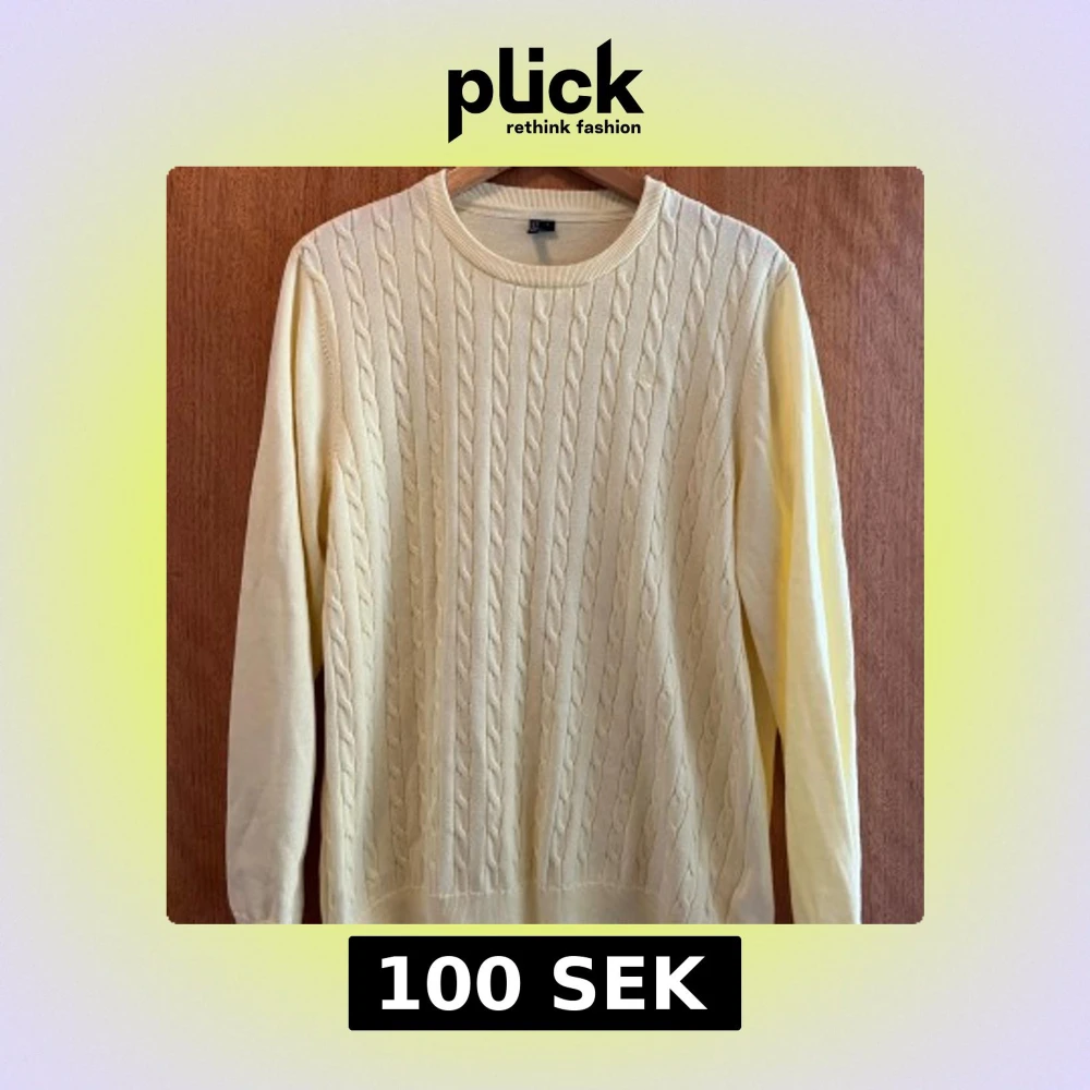 Ljusgul kabelstickad tröja från Hampton Republic i storlek L. Tröjan har rund halsringning, ribbade muddar och ett diskret broderat logomärke på bröstet. Perfekt för dig som gillar klassisk och stilren look.