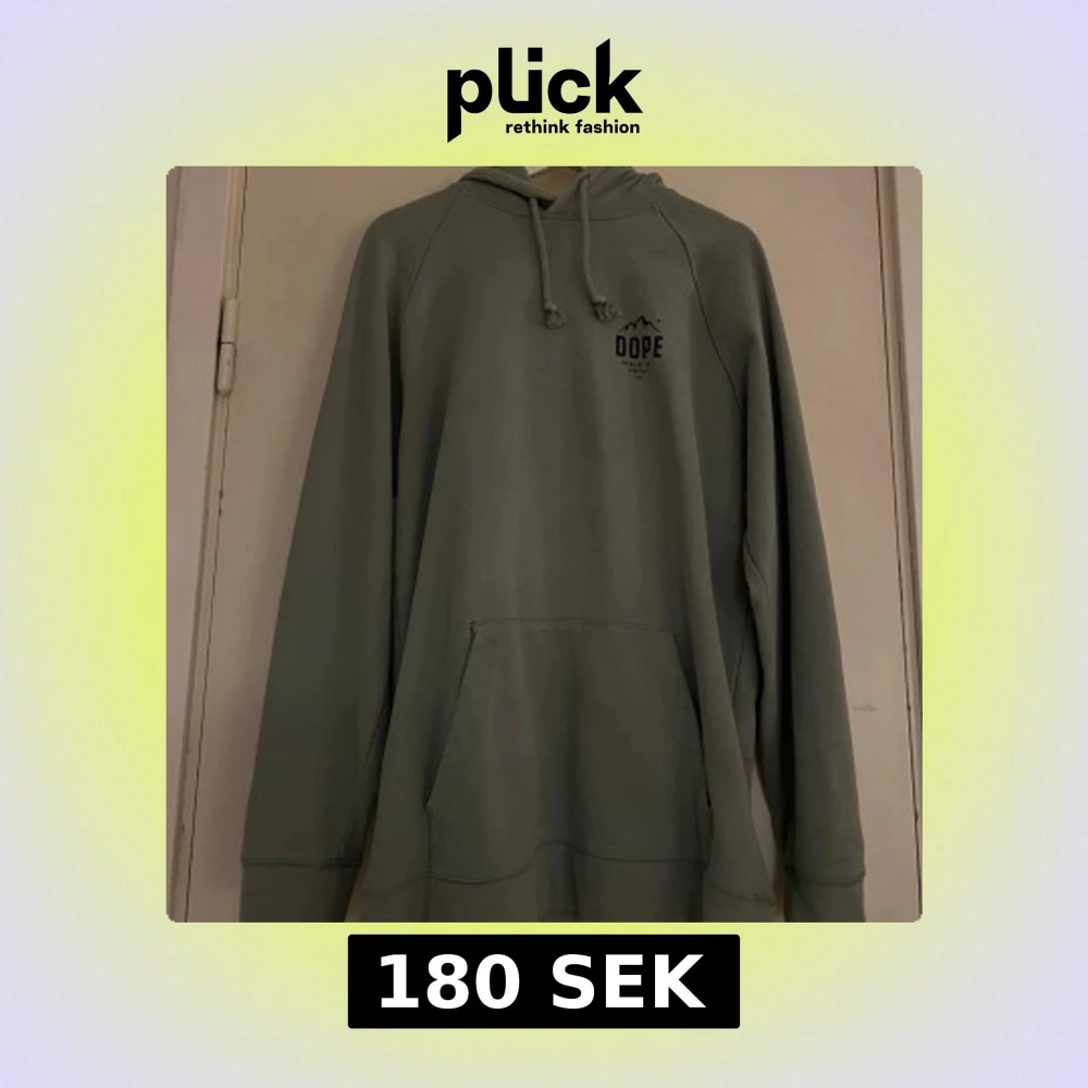 Snygg grå hoodie från Dope med svart tryck på bröstet och stort print på ryggen. Tröjan har huva med snörning och en stor magficka.
