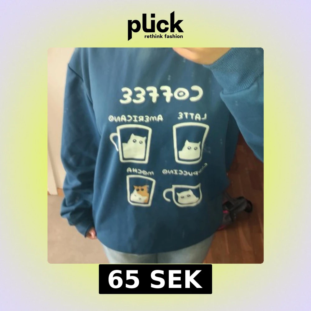 Blå sweatshirt med roliga kattmotiv och kaffekoppar på framsidan. Trycket visar olika kaffedrycker med söta katter i varje mugg. Tröjan har rund hals och långa ärmar, perfekt för dig som gillar unika och lekfulla prints.