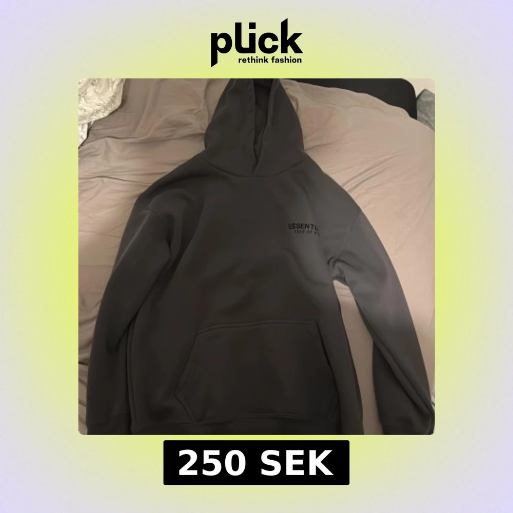 Säljer en mörkgrå hoodie från Fear of God Essentials med diskret logga på bröstet. Tröjan har stor huva, magficka och en loose passform. Perfekt för dig som gillar streetwear och vill ha en stilren look.