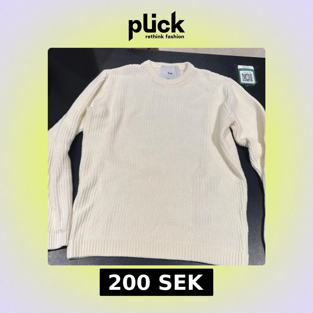 Säljer en krämvit stickad tröja från Use i storlek L. Tröjan har rund halsringning, ribbade muddar och är tillverkad i 100% bomull. Perfekt för lager-på-lager och enkel att matcha med jeans eller kjol.