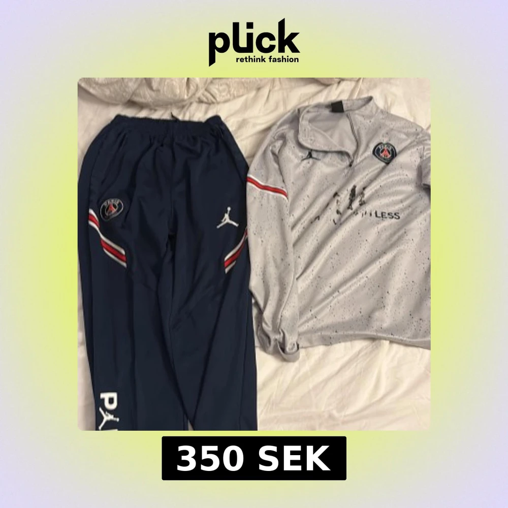 Säljer en grå PSG x Jordan träningströja med svart och blått stänkmönster, half zip och klubbmärke på bröstet. Tröjan har lång ärm, sportig look och röda/vita detaljer på ärmarna. Perfekt för dig som älskar fotboll och streetwear.