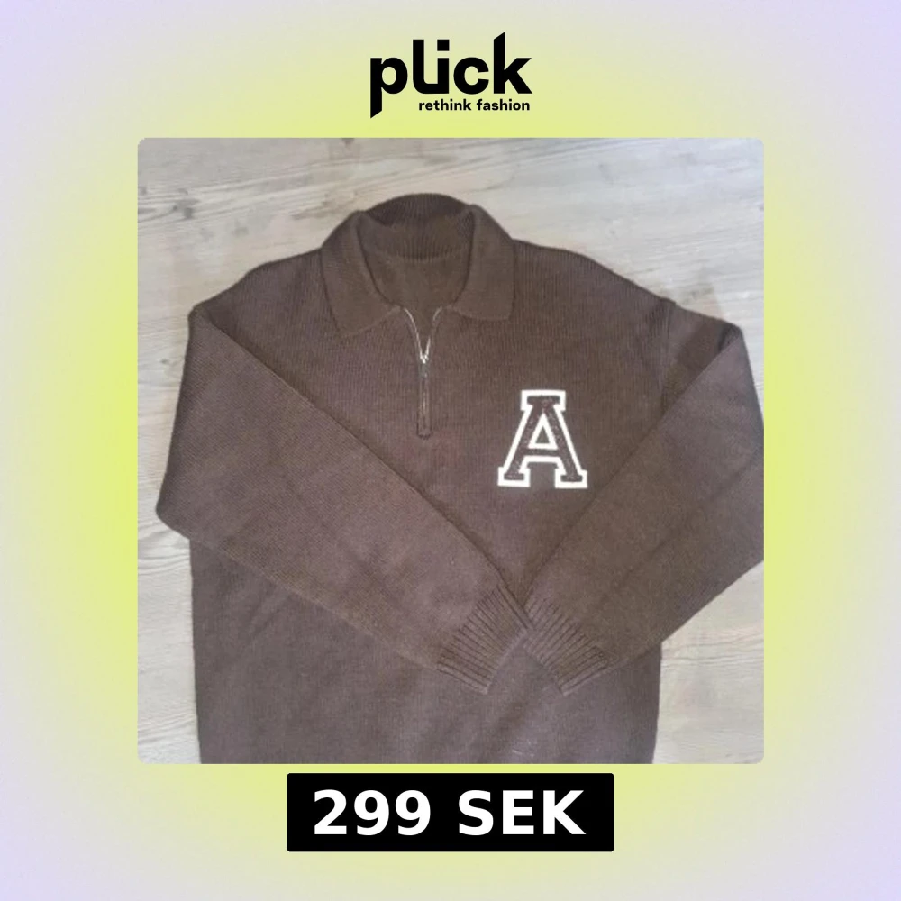 Snygg brun stickad polotröja med halv dragkedja och stor vitbrun A-applikation på bröstet. Tröjan har ribbade muddar och krage, perfekt för dig som gillar college-vibe och vill ha något varmt och chill. Passar dig som vill sticka ut med en cool detalj.