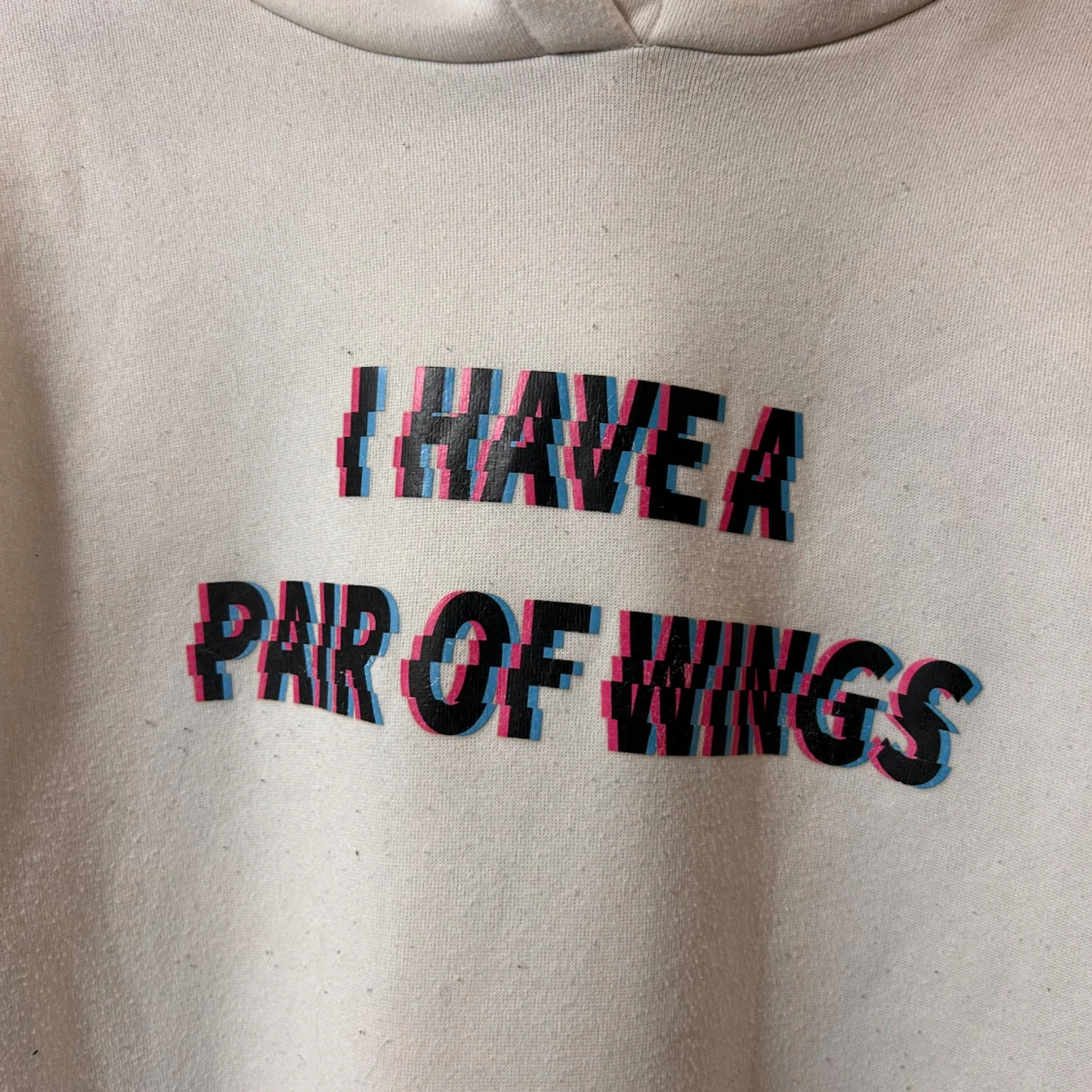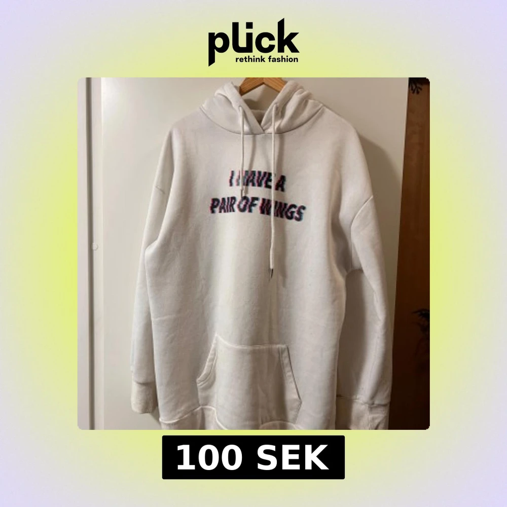 Vit oversized hoodie med trycket 'I HAVE A PAIR OF WINGS' i glitch-stil på bröstet och stora rosa-svarta änglavingar på ryggen. Har huva med snörning och stor känguruficka framtill. Perfekt statement-plagg för dig som gillar unika prints.