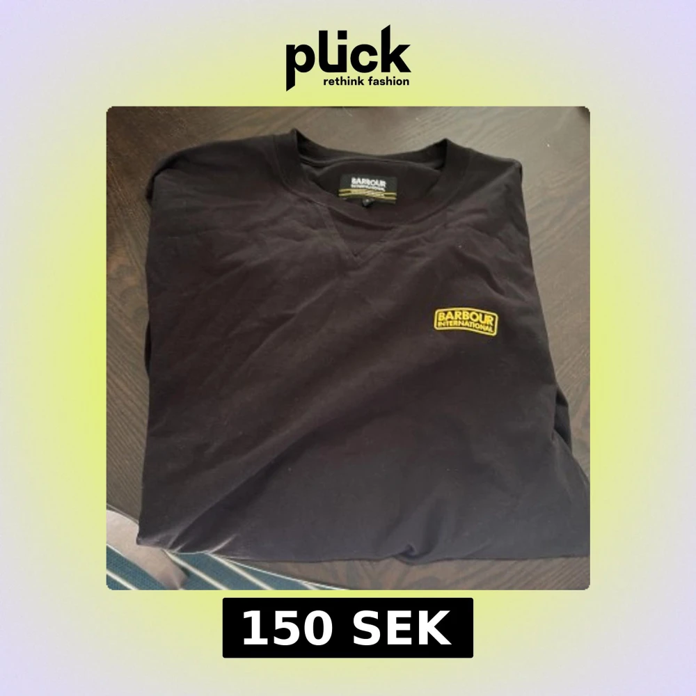 Svart långärmad tröja från Barbour International med gul logotyp på bröstet. Tröjan har rund hals och är gjord i mjuk bomull, perfekt för chill dagar. Enkel och stilren design som funkar till jeans eller joggers. Aldrig använd.