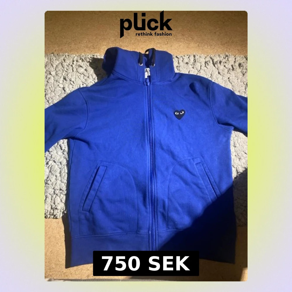 Säljer en blå hoodie från Comme des Garçons PLAY i storlek L. Tröjan har dragkedja, huva med snörning och två fickor fram. Ikoniskt hjärta med ögon på bröstet och ett stort hjärta med ögon på ryggen. Mjuk bomullskvalitet, perfekt för chill dagar.