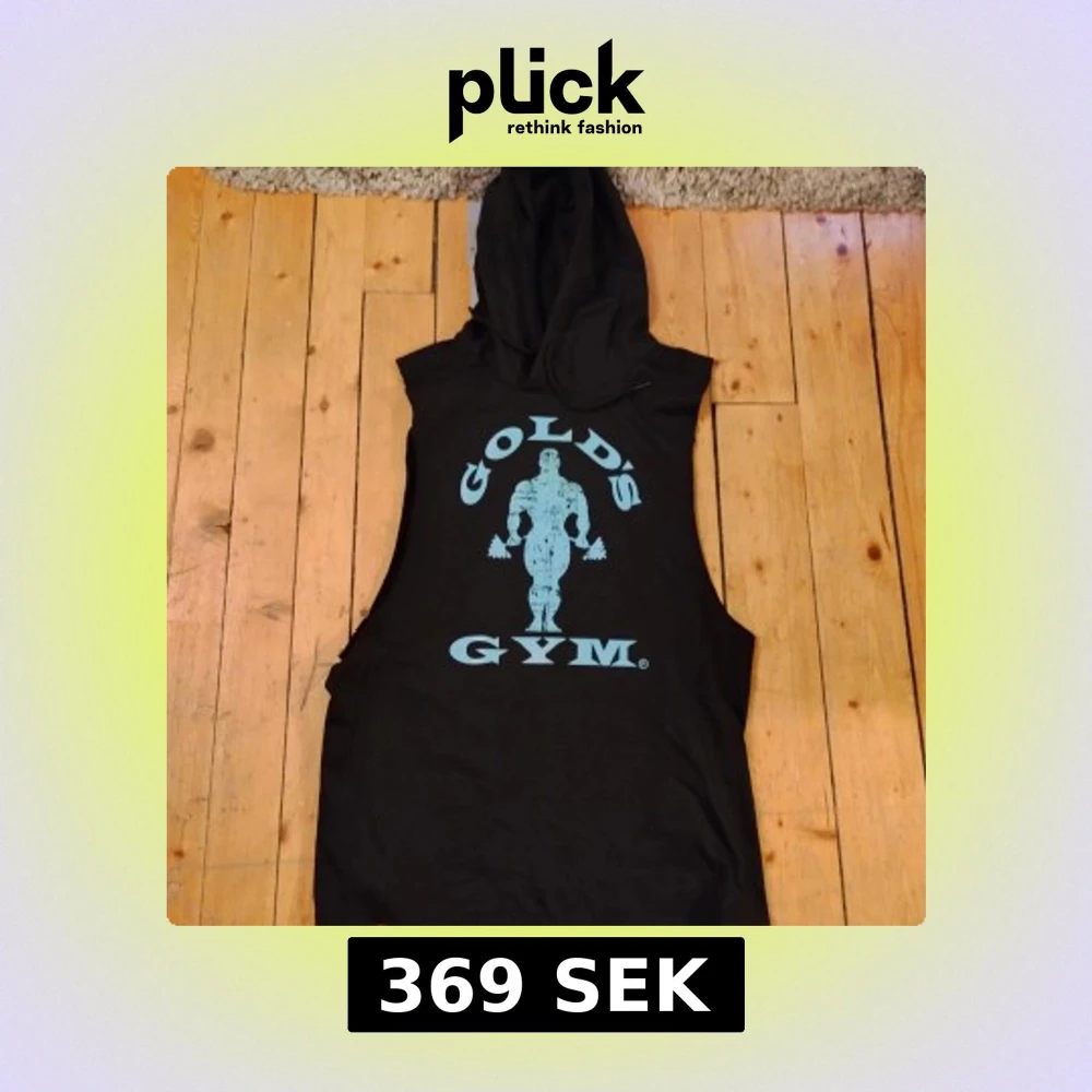 Svart hoodie från Gold's Gym i storlek L, perfekt för gymmet. Tröjan är ärmlös och har en stor huva samt ett stort ljusblått tryck med Gold's Gym-loggan och en bodybuilder på framsidan. Materialet är mjuk bomull som andas bra under träning.