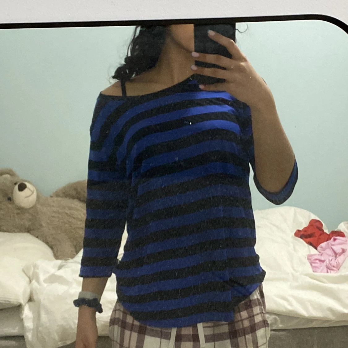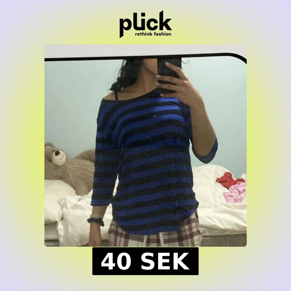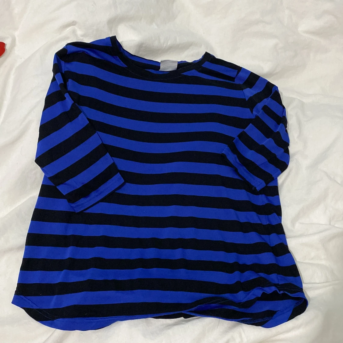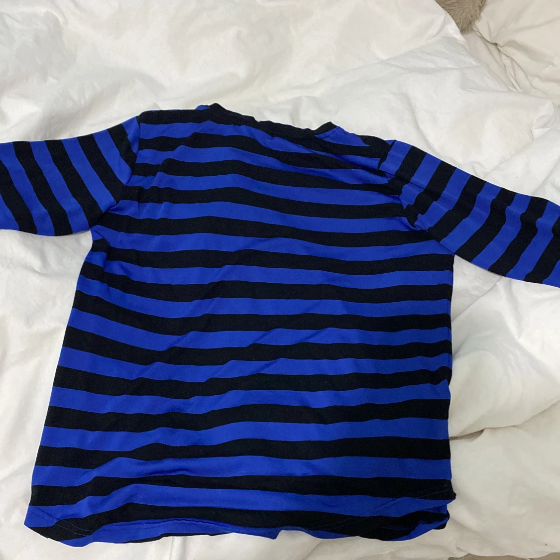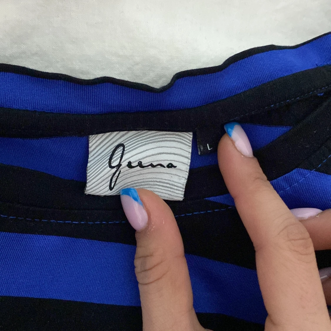 Säljer en blå och svart randig topp från Gena. Den har trekvartsärmar och en avslappnad passform. Supermysigt material. Storlek L, jag är S och bilden är på mig. Skriv vid frågor💕
