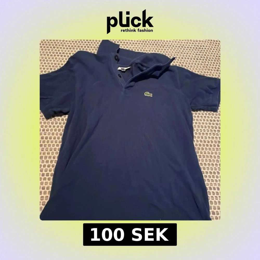 Säljer en klassisk marinblå pikétröja från Lacoste med den ikoniska gröna krokodilloggan på bröstet. Tröjan har korta ärmar, krage och knappar vid halsen. Perfekt för en clean och sportig look.