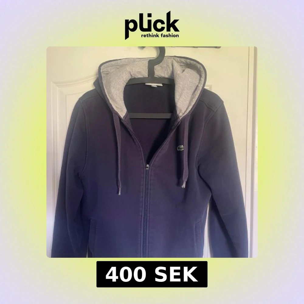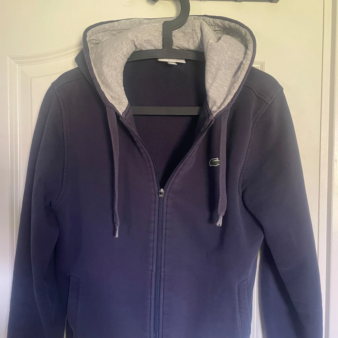 Säljer en snygg mörkblå hoodie från Lacoste med grå insida på huvan och dragkedja framtill. Den har en klassisk krokodil-logga på bröstet och justerbara snören i huvan. Perfekt för en avslappnad stil.