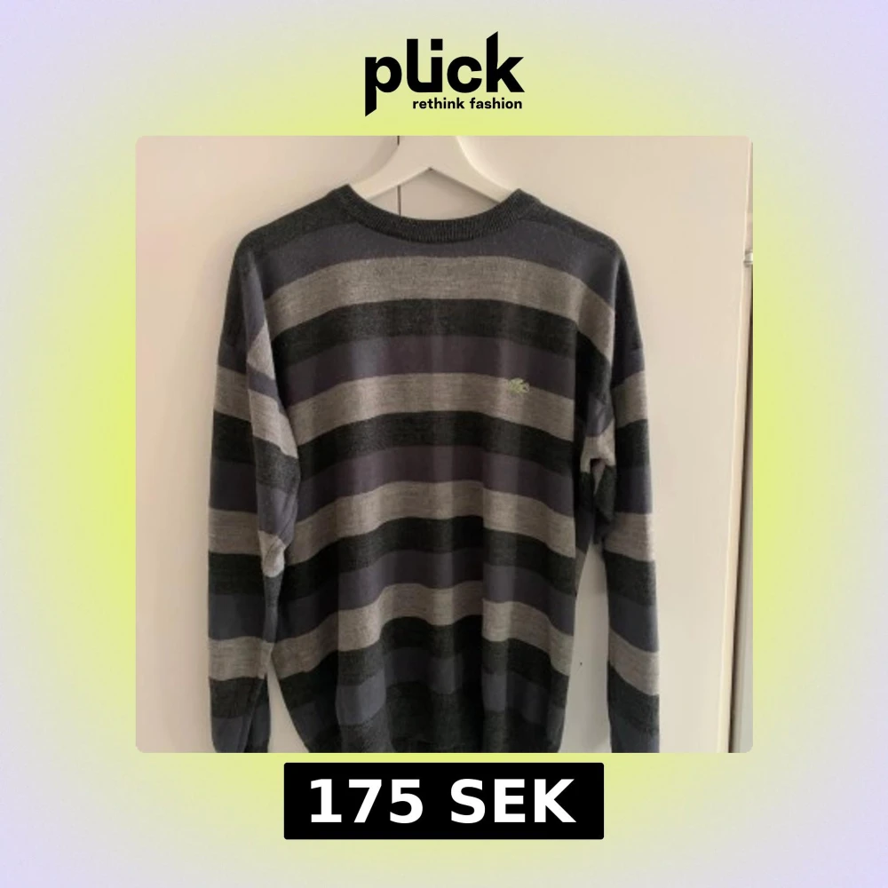 Säljer en randig tröja från Lacoste i grå och mörkblå nyanser. Tröjan har långa ärmar och en klassisk rund halsringning. Perfekt för en stilren och avslappnad look.