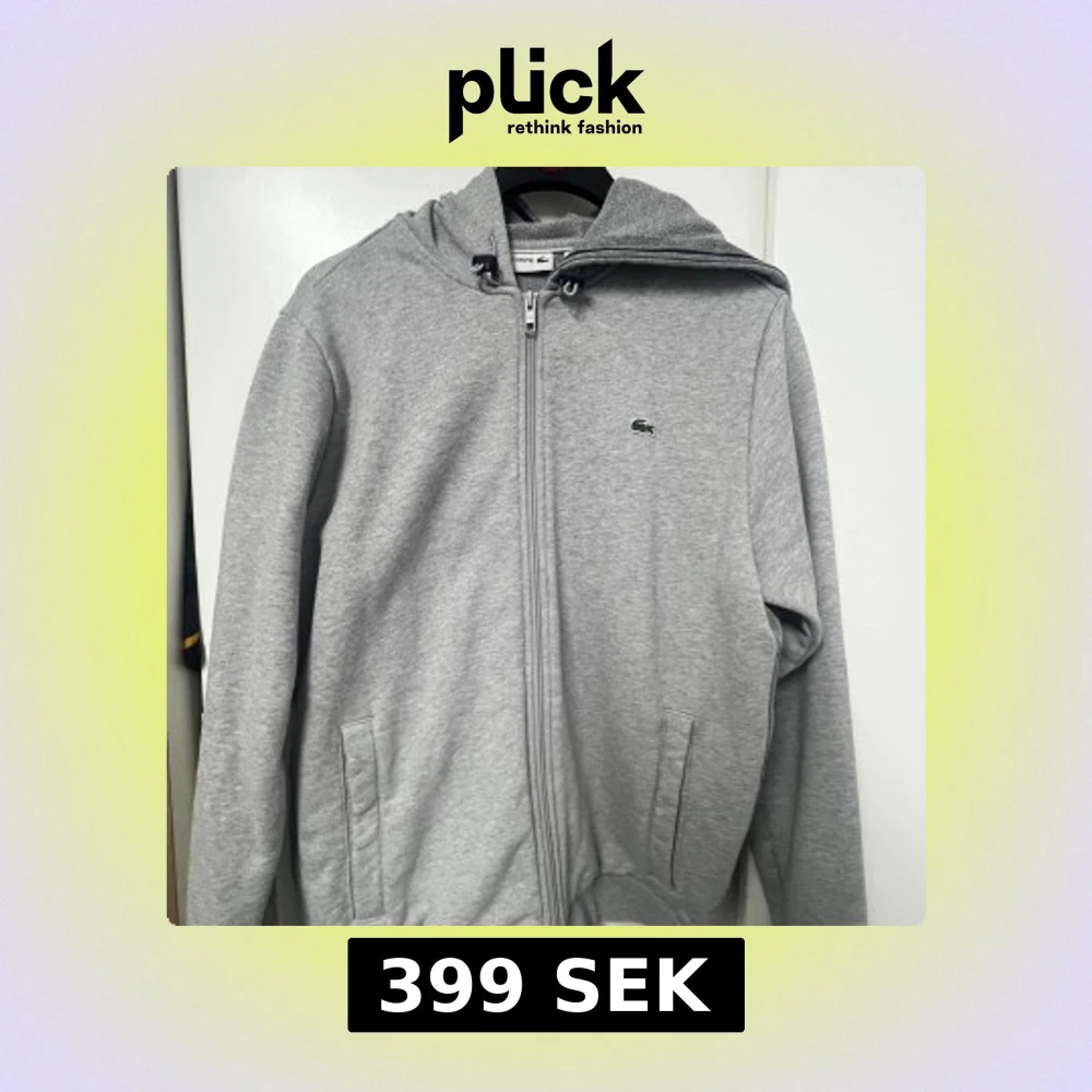 Säljer en stilren grå hoodie från Lacoste med hel dragkedja och klassisk krokodillogga på bröstet. Tröjan har huva med snörning, två fickor framtill och är tillverkad i mjuk bomullsmix. Perfekt för chill dagar eller när du vill ha en clean look. Storlek L