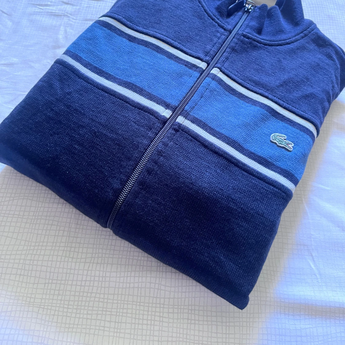 Lacoste Tröja - Storlek M (Herr) Klassisk och stilren tröja från Lacoste med dragkedja framtill. Perfekt för dig som vill kombinera sportig design med tidlös elegans och komfort. Storlek: M (herr) Färg: Mörkblå med blå/vita ränder över bröstet Full dragkedja framtill Hög krage för extra komfort och stil Diskret Lacoste-logga på bröstet Material: Mjuk och bekväm, passar både vardag och fritid