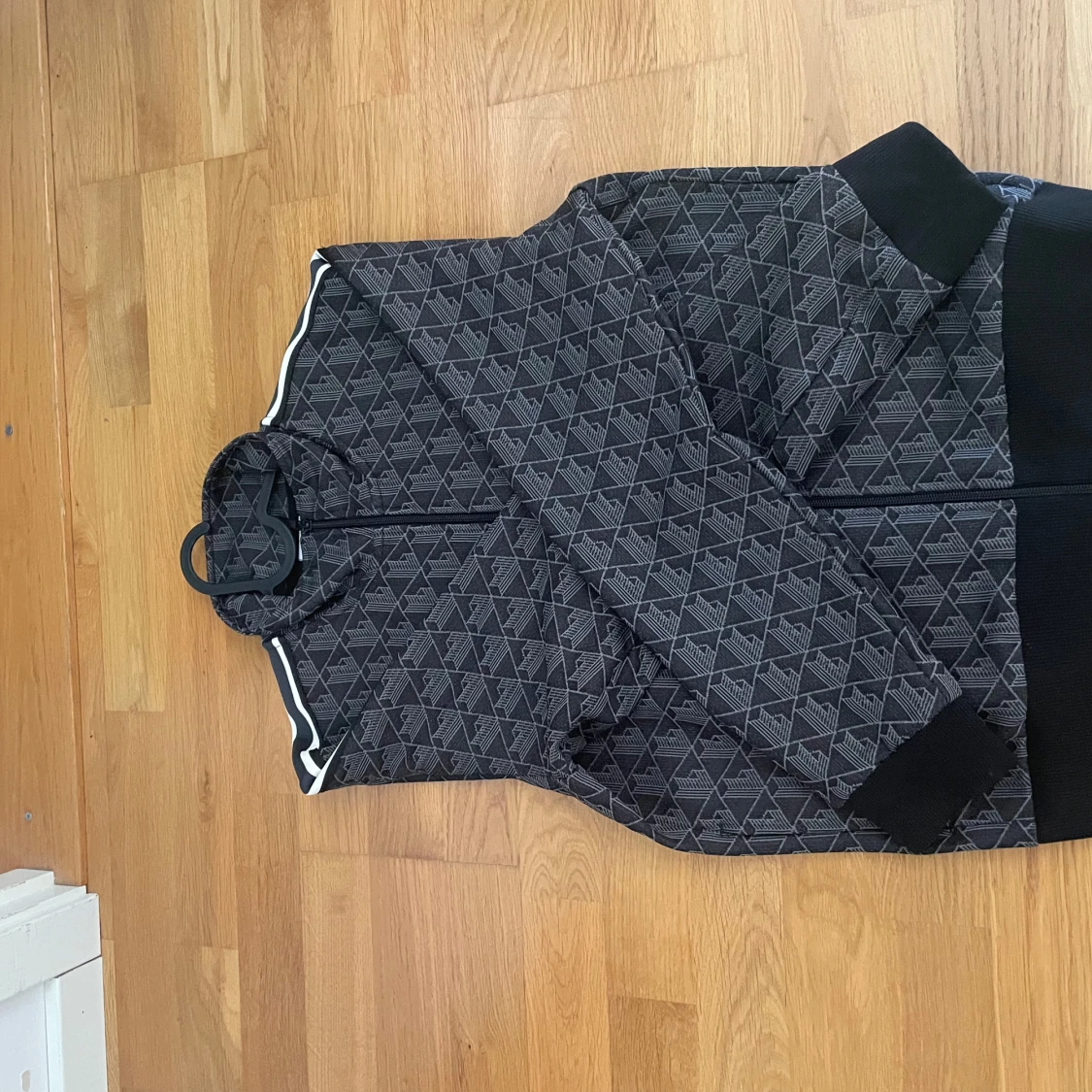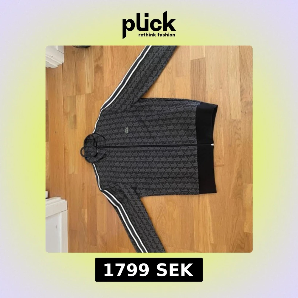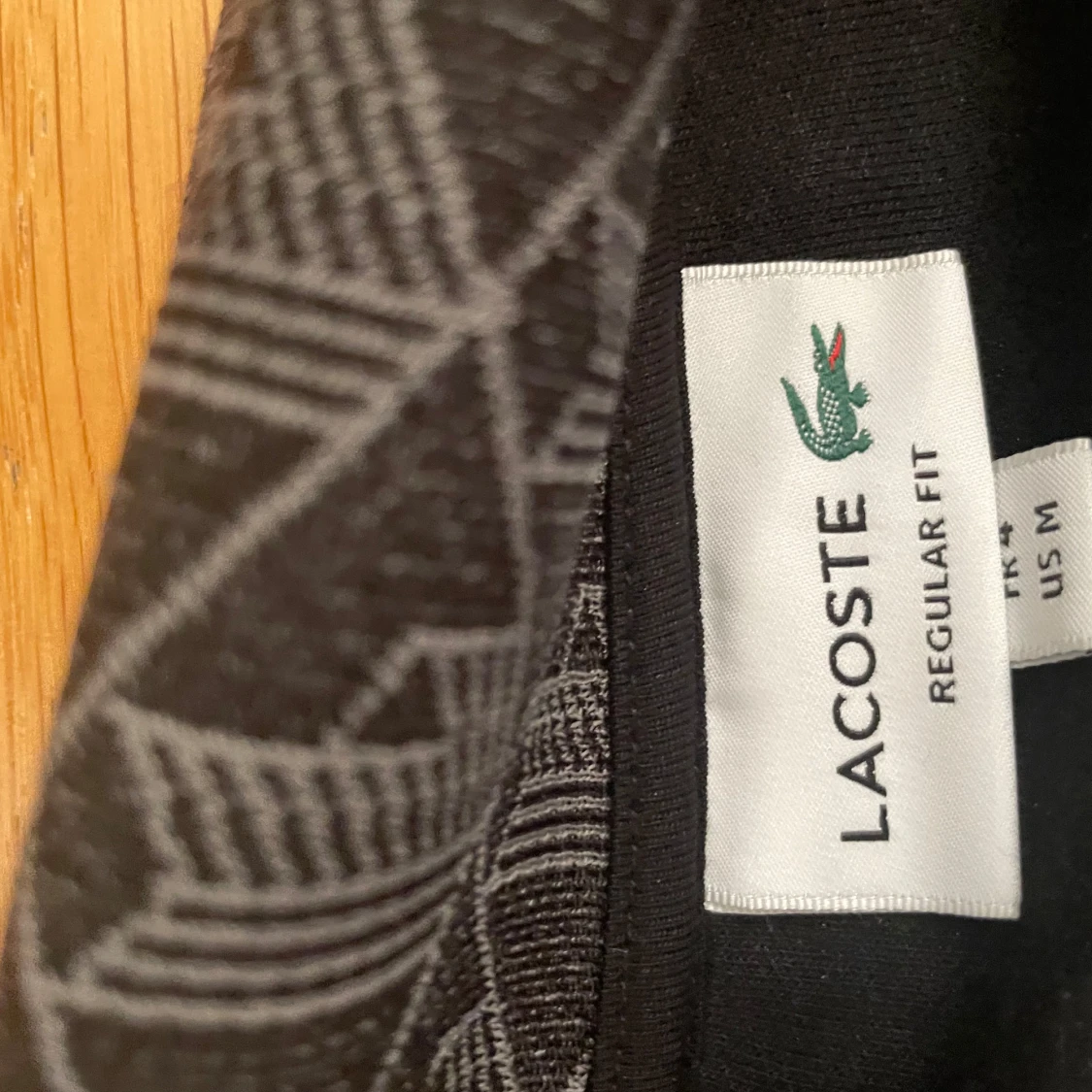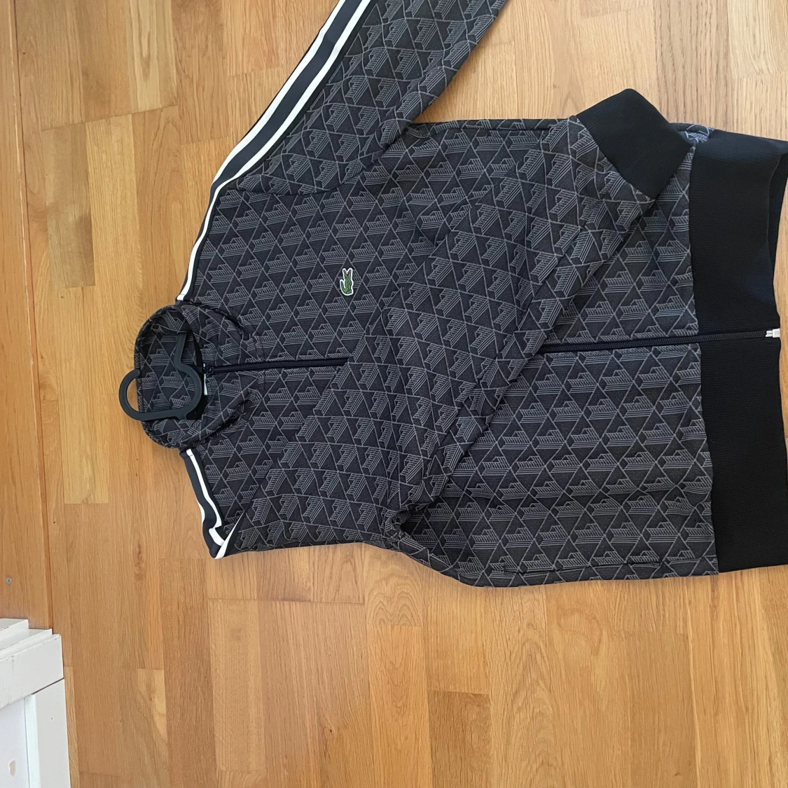 Köpt från Lacoste hemsida för 2300 Kr. Snygg svart tröja från Lacoste med diskret geometriskt mönster och vita ränder längs ärmarna. Tröjan har dragkedja framtill, ribbade muddar och klassisk krokodillogga på bröstet. Perfekt för dig som gillar sportig och stilren look.