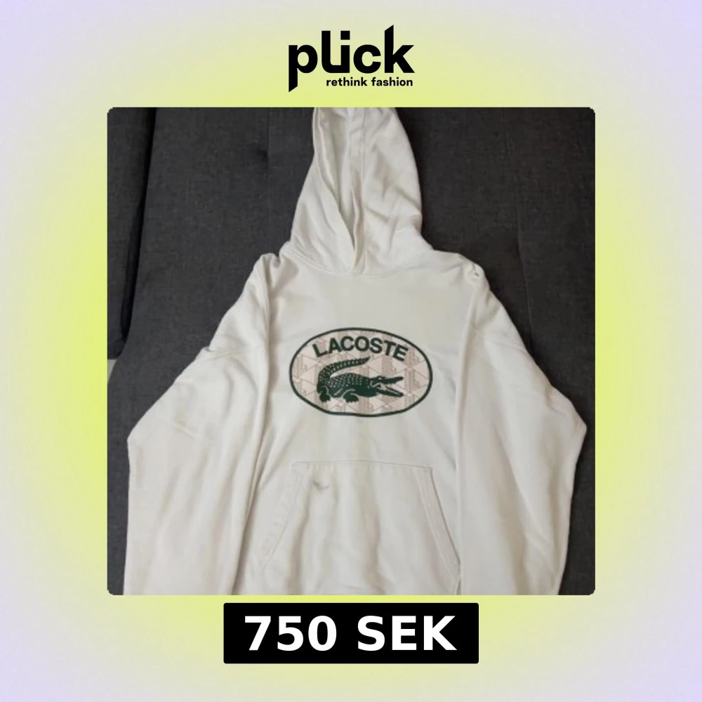 Snygg vit hoodie från Lacoste med stor grön krokodil-logga och text på bröstet. Klassisk känguruficka framtill och huva. Perfekt för dig som gillar streetwear och vill ha en clean look med ikonisk branding.