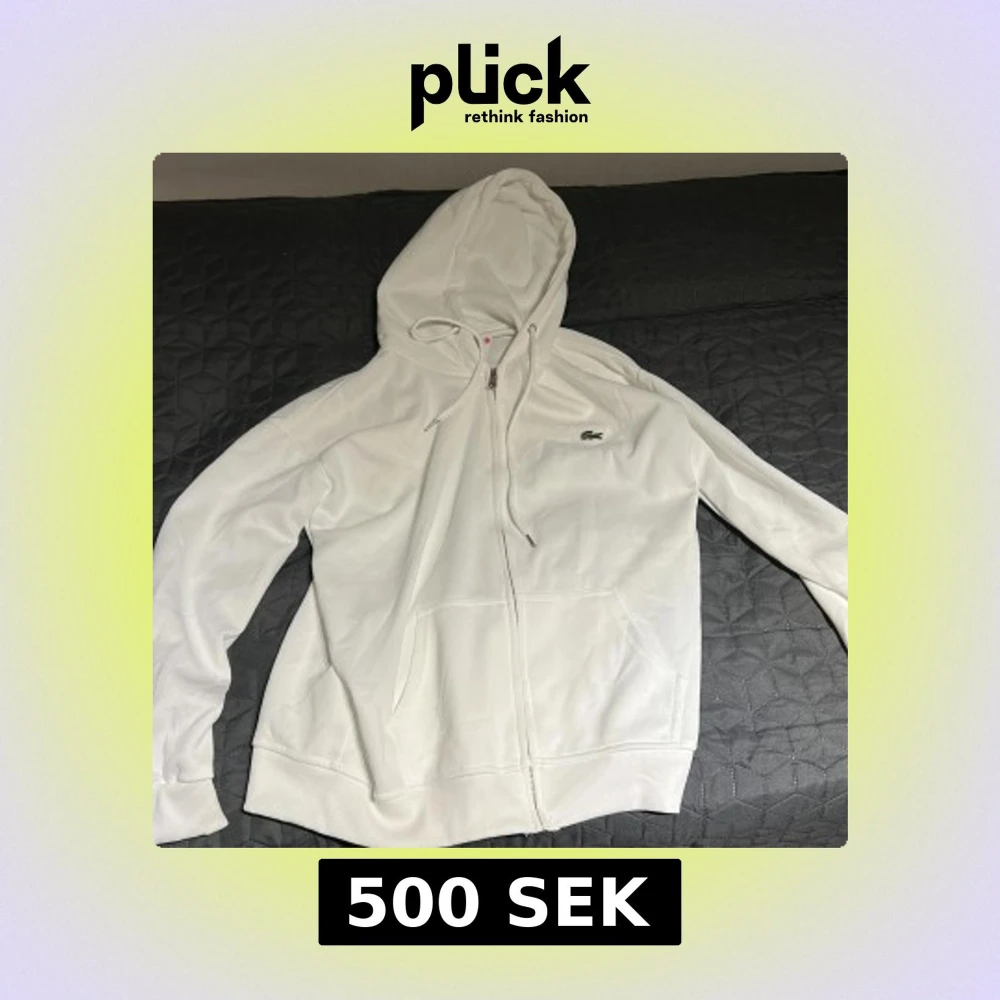 Snygg vit hoodie från Lacoste med dragkedja framtill och klassisk krokodillogga på bröstet. Tröjan har huva med snörning och två fickor framtill. Perfekt för en clean och sportig look.