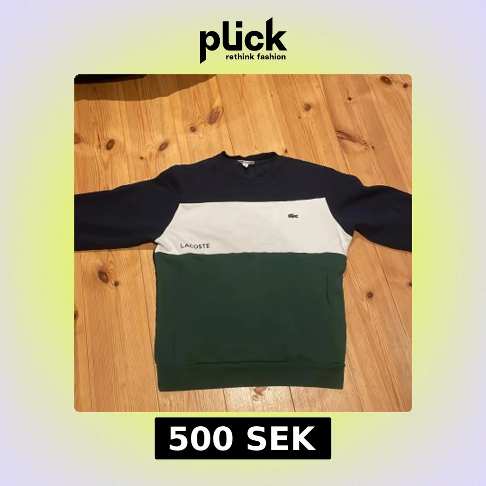 Snygg tröja från Lacoste i tre färger: mörkblå, vit och grön. Den har en klassisk design med Lacoste-loggan broderad på bröstet och texten 'Lacoste' tryckt på den vita delen. Perfekt för en stilren och avslappnad look. Strl medium passar en medium